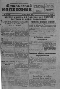 КОМСОМОЛЬСКИ ОТДЕЛ йрезидиума РКК ВКП(б), коллегии РКК и РК ВЛКСМ Мошковского района, о работе групп'„ЛК“ ВЛКСМ, одновременно обдзать руководителей секций РКИ и групп содей В целях практической реализации по становления ЦКК ВКП(б) п коллегии ЛК РКИ и ЦК ВЛКСМ «О работе групп «легкой кавалерии» — РК ВКП(б), •коллегия РКИ и РК ВЛКСМ считают: чтобы сделать «ЛК» действительно бое ш и и массовый движением рабочей и колхозной- молодежи, «одной из форм обучения делу управления государством является сосредоточить ее деятельность на систематической проверке ди ректив партии и правительства, на ор ганизацию повседневной борьбы с бю рокргтизмом, на улучшение работы всех звеньев аппарата управления кол хозов, по охране соцсобстоенности» (Из постановления ЦК ВКП(б), ЦК РКИ, ЦК ВЛКСМ).. Организовать боевое выполнение ука зяеий центральных органов через про ведение следующих мероприятий: 1. Возложить персональное систематическое руководство группами «лег квх кавалеристов» в РКИ РКИ и РК ВЛКСМ на члена бюро, пред. -КК РК ВЛКСМ' т. Веремеенко, считая его пред ставителем РЕ ЕСМ в РКИ по линии «ЛК» и организации работы комсомола т, РКИ. v 2. Обязать ячейки ВКП(б), ВЛКСМ; секции РКИ и группы содейст бия РКИ обсудить ’постановле*- яке ЦКК В Ш б ) , НЕ РКИ п ЦК ВЛКСМ па объединенной собрании с целы# практической их’ реали нации- Поручить т ’. т. Колмогорову (КЕРКИ) н Зуеву (РК КСМ) ‘ командире вать необходимое' количество актива РКК РКИ и РК ВЛКСМ. 3. Возложить персональную ответственность-за работу групп «ЛК» в се л а х ' и колхозах на секретарей ячеек ствия РКИ оказывать помощь «ЛК». 4 ; Провести по району рейд массовой проверки с участием в етом групп «ЛК»; и пионерских отрядов *в: декад ни к (с 25 августа по 5 сентября). На чало рейда, проверки об’явить ударным имени 19 МЮД’а. Проверку провести по вопросам: 1) охраны урожая, колхозного и сов хозного имущества, правильности орга низацпи уборкн, борьбы -с потерями (устройство и иОпользование зерноуловителей, охрана полей и т. д.), своевре м«нной уборки посева, выполнения пла. нов поставки зерна государству; 2) выполнения планов мобилизации средств, мясозаготовок, вспашки зяби, посева озимых и других .хозяйств енно- нолитичеекпх мероприятий5. Руководство рейдом проверки воз дожить па секретарей ячеек БКП(б), ВЛКСМ, руководителей секций- РКИ и групп * содействия 'РКИ.' Обязать послед них принимать самые строгие меры к виновникам срыва выполнения директив партии и правительства. ■ 6. Поручить т. Веремеенко и Зуеву проверить выполнение данного реше нея через массу, ячейки ВЛКСМ, (особо о работе «ЛК»), секции- РКИ и грун пы -содействия РКП :— по селам: Мот ково, Мошково, и. Ояш, Дубровин-о, сов хозам: чебулинскому, «Буксиру» и 302. 7' Данное решение опубликовать ’ в газете «Мошковский колхозник». Пред. РКК-РКИ КУШТЕНКО. Секретарь FK ВЛКСМ НАЙПАТЧЕНКО. „Легкая кавалерия" проверяет (Сельхозартель «Новый свет»), Плох-рй уход за лошадью- в нашем j за пастьбой, выбрать . хорошее место для пастьбы:, спит. Лошади, уетаПшие ’за колхозе. Комсомольская ячейка решила: проверить и наити причины. Послали «легкую кавалерию», к-ото-. рая выяснила, что ночной конюх Воробьев Егор вместо того, чтобы следить день, хорошего корма от такого конюха не получают. «ЛЕГКАЯ КАВАЛЕРИЯ». С первых же дней работы школы вести борьбу за качество ■С 1 сентября больше 14 тысяч 