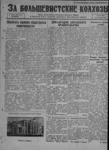 № 41 (637) За большевистские колхозы © ПРОВЕДЕНИИ СЕНОУБОРКИ И СИЛОСОВАНИЯ В К О Л Х О З А Х И С О В Х О З А Х О БЛ АС ТИ Постановление исполнит ельн ого комитета Новоси бирского о б л а ст н о г о совета депутат ов т р удящ и х с я и бю р о Новосибирского о б ком а ВКП(б) от 13 июня 1 9 4 0 г. Y П р о в е р к о й В ен ге ров с ко го и У сть-Таркского районов у с т а новлено, что с е к р е т а р ь Венг е ров ско го райкома ВКП(б) т . Аленицкий и п р е д с е д а т е л ь райисполкома т . П инчук , с е к р е т а р ь Усть-Т аркского р айк о ма ВКП(б) т . Гарнышев, п р е д с е д а т е л ь райисполкома т. Та- т а р о в не о б еспечили вы пол нение п остановл ения бюро обкома ВКП(б) и исполните л ь н о го комитета областного сов ета д е п у т а т о в т р у д ящ и х с я от 25 а пр е л я 1940 г. „ О с о з дании кормовой базы д л я ж и в о т н о в о д с т в а 4. Вместо то го , ч тобы полностью о т р е м о н т и р о в а т ь все с ен оуборочны е машины, инв ента р ь и подготовить си л о сные с о о р у ж ен и я к с року, устан о вл ен н ом у р е ш е н и е м облисполкома и бюро обкома ^ Ш Ш ( б ) , в Венгеровском р а й о н е из 1.096 сен о к о сил о к от ремонтировано вс его 418, из имеющихся 925 конных г р а б лей отр ем о н ти р о ван о 549. В Усть-Таркском район е из 514 сенокосилок о тр ем о н ти р о вано 208, из 411 конных г р а б лей отремонтировано 281. Не закончены ремонт с и л о с о р е з о к , силостных с о о р уж ен и й , и з го т о в л ен и е во л о к уш , с т о г о м е т а т е л е й . В ряде МТС (Н и к о л а е в с к а я , К амыш ев ская) машинно-сенокосные отряды к сен окос у не готовы. Р у к о в о д и т е л и В ен г е р о в с ко го и У сть-Таркского районов, п р е д с е д а т е л и кол х о з о в и д и р е к т о р а совхоррв не учли , . .ошибок прошлого го да, ког- м щ а из-за б еспечно го их о т н о шения к с е н о у б о р к е с е н о к о сные площади были не скоТ а к о е по л ож ен и е с подго- кошения д л я з ападных райо - т о в к о й к с ен оуб орке и с и л о сованию с о з д а е т у г р о з у с р ы ва с в о е в р е м е н н о г о и полного о б еспечения животноводства кормами. И сполком областного с о в е т а д епутатов т р у д ящ и х с я и |б ю р о обкома ВКП(б) п о с т а н о в л я ю т : 1. О б я з а т ь об л зо , д и р е к т о нов обл ас ти не п о зднее 20 июня, д л я о стал ь ны х р а й о нов не позднее 25 июня, а с и л о с о в а н и е ; в о в с ех р а й о нах с 15 июня с. г. 4. О с у д и т ь сущ е ствую щ и й п о р я д о к у к л ад к и с т о г о в раз мерами 10—15 ц ен тн е р о в приводящий к огромным по ВТОРАЯ СЕССИЯ РАЙОННОГС СОВЕТА ДЕПУТАТОВ ТРУДЯЩИ 17 июня в районном к л у б е села М ош ково с о с т о я л а с ь в то р а я сессия районно го с о вета д е п у т а т о в т р у д я щ и х с я , на которой п р и с у т с т в о в а л о 32 д еп у т а т а и 50 ч е л о в е к г о с т е й . 4 — • X ' “ " “ — * / j , * I V * * “ Л - 1 — - > - - - - « V » p v / ш т л II I 11V ров с о в х о зт р е с то в , пред с е д а - те рям сена. О бя зать райисшены, а с к о т о с т а л с я без т е т е й райи сполком ов и с ек р е тар е й райкомов ВКП(б). На- рымский окрисполком и о к р у ж ком ВКП(б): а) нем едленно принять м е ры, обеспечивающие б е з у с ловное выполнение у ка зан и я СНК СССР и ЦК ВКП(б) от 4 июня 1940 г. о п о д го т о в к е и проведении с еноуборки и силосования в к о л х о з а х и с о в х о з а х о б л а с т и ; б) до начала с ен оубороч ных работ п р о в е р и ть к а ч е с т во ремонта вс ех с ен о у б о р о ч ных машин и инв ен та р ь , з а к о л х о зни к ам и и рабочими сов х о з о в ; в) с о с т а в и т ь по к аж дом у к о л х о з у и совхозу рабочие планы по с ен о у б о р к е и силосованию , п р е д у с м о т р е в ис по