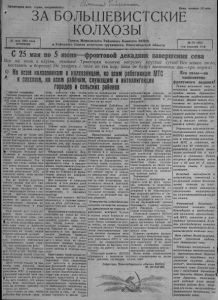За большевистские колхозы № 35 (956) По представл ению партийных организаций, полит отд елов МТС и с о в х о з о в и сельсоветов з а самоотверж енный т р уд на весеннем севе з а н о с я т с я на р а й о н н ую д о с к у почета передовики социалистического с о р е вн о в а н и я: 19. Т р а к т о р н а я б р и г а д а № 5 Сокурской МТС (бригадир П. П. Б о р о д и н ) , выполнившая план т р а к т о р н ы х р а б о т на весеннем с е в е на 131 про» цент , да вш а я на к аж ды й 15-сильный трактор 150 г е к т а р о з в переводе на мягкую пахоту. 20. Т р а к т о р н а я б р и г а д а № 14 Сокурской МТС (б р и г а д ир П. С и д о р о в ) , выполнившая план т р а к торны х работ на весеннем севе на 126 процентов. 21. Т р а к т о р н а я б р и г а д а № 9 М о т к о в с к о й МТС (бри гадир Т у р и к о в В а с и л и й ) , выполнившая план т ра кторных работ на весеннем севе на 106 проц ентов . 22. Т р а к т о р н а я б р и г а д а 13, Ром ановской МТС (б ри гадир А. К о м б и к о в ) , с дел авш ая на к ол есны й т ра ктор 138 га в п ере воде на мягкую п а х о т у . Бригадиры тракторных трактористы , пахари, бори тесь з а п о л у ч е н и е обл а ст ны х премий! Обком ВКП(б) и облис- олком установили пре- и и бригадирам троктор- I X бригад, трактористам п ахарям , давшим наи- лылую выработку в пе- иод весеннего сева. Лучшим бригадирам акториых бригад: 1. зоотые именные часы; 2. рисвоение з в а н и я лучше- б р и г ад и р а тракторной игады Новосибирской бласти. Передовым тракторным ригадам: 1. Мотоцикл; на 10 тысяч рублей пром- варов; 3. постоянное Кра- ое знамя обкома ВКП(б) облисполкома, 4. наг- дждение передовых т р а к тористов этой бригады почетными грамотами. Лучшим трактористам: 1. Именные серебряные часы; 2. присвоение з в а н и я лучшего тракториста Новосибирской области; 3. костюм; 4. награждение почетной грамотой обкома ВКП(б) и облисполкома. Лучшим пахарям: 1 . ч а сы и костюм; 2. награждение почетной Грамотой обкома ВКГ1(б) и облисполкома; 3. награждение значком „Отличник со ц и а листического земледелия"; 4. Присвоение звания л у ч шего п а х а р я Новосибирской области. р а к т о р я а я б ри гад а И. Луценко полностью вы п о л н и ла годовой план тракторных р а б о т 24 м а я тракторная бри- ад а № 25 Романовской 1ТС полностью закончи- а годовой план трактор- ых работ, выработав на аждый 15-сильный трак- ор 210' гектаров в п ереводе на мягкую пахоту. Б р и г а д а И вана Петровича Луценко сэкономила 1000 килограммов горючего. З а самоотверженный труд н а полях в 1942 г о д у тт. И. П. Луценко, А. Чернов и А. Луценко на-днях получили н а гр а ду — значки „Отличник социалистического землед е л и я " . Тракторная брига да то в. Луценко сейчас борется за получение первой областной премии. Н. Дашков. Ря занов Григорий строго следит з а качеством Колхоз „Красное пламя" посеял 245 гектаров з е р н о вых к у л ь т у р и ка ртоф е л я и посеял их вы сококачественно. Строгий контроль за к а ч е ством полевых работ установил инспектор по качеству Ря занов Григорий Ф едо тович. Тов. Р я з з н о в е ж е дневно тщательно просматрив ает ка че ст во пахоты, боро нования, культивации и сева . Плохо сделанную работу тов. Р я за н о в не принимал, заставлял п еределывать. Ч а сто такие промахи были в бригаде № 1 (бригадир Демин). На нескольких г е к та р ах з д е с ь посеяли на необработанную землю о в ес, тов. Р я зан о в н е медленно запретил сев по не культивированной земле. Григорий Федотович сам об у ч а е т молодых бороноволоков и пахарей, как л у ч