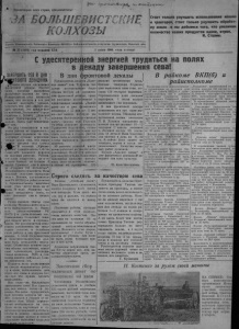За больше ia ф р о н т а х отечественной войны О б з о р в о е н н ы х д е йс т в ий з а В районе с е в е р н е е Яссы на- | н войска 30 мая отбивали гаки крупных сил пехоты и Очков противника. Це н о ю рльших потерь в живой с и - и т е хнике противнику у д а - К'ь не з начительно вклинить* в нашу о б о р о н у . По пред- | рительным данным за день. | я наши войска уничтожили [ подбили 5 0 немецких танков [ сбили 36 самоле тов . [На остальных фр о н т а х за | т е к ш и е 7 дней с у ще с т в е н - i x изме нений не произошло, шааия и корабли Красно- аменного Балтийского флота Ьесли ряд ударов по кораб- |м противника. В ночь на мая наши летчики потопи- 2 немецких транспорта 1им во д о и з меще ни ем в 7 :яч тонн. В ночь на 27 мая ю л е т ы — торпедонос цы почили в Рижс ком заливе 2 д. ных н е м е ц ки х транспор- Кроме того, 2 транспор- противника водоизмеще* гм в 7 тысяч тонн потоп- | jы в Финсьом заливе . На- IX корабля Красноз наменце Балтийского фло т а , на 1ясь в д о з о р е , о б н а р у жи л и рло о д н о г о из островов ( некого залива вр аже с к ую вводную л од к у . Наши ко- (ли не ме д л е нн о атаковали! [ в о д н у ю л о д к у и потопили! 126 мая 70 само ле т о в про- гика пытались атаковать |я из о б ъ е к т о в нашего в р е м я с 24 по 30 мая 1944 г. флота в Финском заливе . Сове т с кие л е т чики— истребители рассеяли самолеты врага, вынудив их б ро с ить бомбы в море. В во з душных боях наши летчики сбили 20 н е м е ц ких с а м о л е т о в . 2 наших самолета не ве рнулись на свой аэ родром. Ч е р е з де нь немецкая авиация опять пыталась совершит* налет на наш военный о б ъ е к т в Финском заливе. Зенитчики и истребители Красноз наменного Балтийского флота рассеяли враже с к и е самолеты. Советские летчики сбили 6 самолетов противника. 2 враже ских самолета сбиты огнем зенитной артиллерии. Наша авиация потерь не имела. Советская авиация произ ве ла массированный налет на аэродромы противника в райо не г о р о д о в Роман и Хушн (Румыния) . В момент валета на э тих а э ро д рома х н а х о д и лось много немецких самоле тов. Совет с кие летчики подавили вр аже с к ую зенитную артиллерию из нескольких з а х о д о в бомбами и пушечно- пулеметным огнем у н ич т о жи ли и повредили не м е н е е 60 самолетов противника Все наши самолеты вернулись на свои базы. За время с 23 по 29 мая в в о з д у шных боях и огнем зе нитной артиллерии сбито 137 само ле т о в противника З а самоотверж енный труд н а п о л я х и обр а зц о в о е в ы п о л н е н и е п р о и з в о д ст в е н ны х за д а н и й н а севе з а н о с я т с я н а р а й о н н у ю доску почета. 31 . Т р а к т о р н а я б р и г а д а С о к у р с к о й МТС ( бригадир т. Перкин) , выполнившая план весенне-тракторных работ на 103 проц. 32. Тр а к т о р на я б р и г а д а С о к у р с к о й МТС ( б риг а дир т. Е р м о ч е н к о ) . выполнившая план ве с е нне - т ра к торных работ на 106 проц , выработавшая 102 га на 15 сильный т рактор . 33. Тр а к т о р н а я б р и г а д а Р о м а н о в с к о й МТС ( бригадир т. Р у д е н к о ) , выполнившая план ве с е нне - тракторных работ 34 Тр а к т о р н а я б р и г а д а Р о м а н о в с к о й МТС ( бригадир т. Рыб ч е н к о ) , выполнившая план в е с е нн е - тр а к торных работ. Занимае мое место Сельсоветы Фамилия пре д с е да теля 1 Р е п ь е в с к и й Сагайдак 2 В е р х - Б а л т и н . Су х а р е в 3 М о т к о а с к и й Михия 4 М о ш к о в с к и н Минаков 5 Б у г о т а к с к и й 11етренко 6 В о з н е с е н с к и й Ельков 7 Т о м и л о в с к и й Бесценная 8 Б а р л а к с к и й Заиичковская 9 П е р г с к и й Шу р а ко в 10 