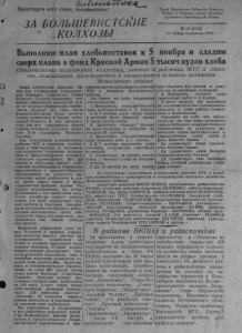 За большевистские колхозы № 50 (1043) Безоговорочно выполнять задания по хлебосдаче Проходит предоктябрьская фронтовая декада. 25 о к т я б р я колхозы нашего района должны отчитаться о выполнении декадного фронтового задания по хлебосдаче. Но многие колхозы сорвали выполнение заданий по хлебо заготовкам. Колхозы Ново-По- росского сельсовета (председатель и секретарь парторганизации тов. Гаврин) соверСдадим к 25 октября сверх плана в фонд Красной Армии 300 пудов х л е б а Обязательства колхозников и колхозниц колхоза „3-й райсъезд советов“ Мы, КОЛХОЗНИКИ и колхозницы сельхозартели 3-й рай- с ’езд советов14, обсудив обращение колхозников и колхозниц Черепановского района и колхоза „Б ол ьш еви к4, Мош- ковского района о п р е д о к тябрьском социалистическом соревновании за досрочное выполнение плана хлебосдачи шенно не участвовали в эти и сверхплановую сдачу хле- дни в хлебосдаче. Колхоз с радостью поддерживаем „Советский путь , Ново-Со- их почин# Мы включаемся в курского сельсовета, за 5 дней всего сдал 43 центнера, сорвав фронтовое задание. Ме'жпредоктябрьскоесоревнование, дадим* больше хлеба и д р у гих продуктов ф рон ту и поду тем в. этом колхозе лежит можем Красной Армии в оконА 4 Н П Г П З Р Л Н Я Н П Ч 7 Т А Г К Н А ГТПТ4- г 1 много зерна, но здесь не при дожили усилий, чтобы высушить его. В колхозах им. Ворошилова и , Майское утро" преступно затягивают обмочательном разгроме немецко фашистских захватчиков. Мы берем на себя с л едую щие обязательства: Наш колхоз' досрочно рассчитался по комбайны и молотилки. Из-за! плохой организации обмолота здесь ежедневно срывается график вывозки зерна. В сельхозартели „ Б о р е ц 4 намолоченное и очищенное зерно лежит в амбаре, а хл ебо сда ча срывается. Все это говорит о том, что некоторые наши председатели колхозов и сельсоветов встали на путь срыва хлебозаготовок, а упол номоченные РК ВКП(б) и райисполкома этих колхозов и советов потеряли всякое чувство ответственности в борьбе за хлеб, не разоблачают в отдельных с л у ч а я х срывщиков хлебосдачи. Поэтому наш район не выполнил фронтового задания по хлебозаготовкам, данного на период фронтовой декады с 15 о к тября. Каждый колхоз и совхоз должен безоговорочно выполнять ежедневный гр аф и к по хлебосдаче. День и ночь ве- с"ти обмолот и вывозку хлеба, организовать тщательный сбор потерь. Сделать все, чтобы каждый колхоз и с о в х о з , с честью выполнил свои обязательства в предоктябрьском соревновании. Выполнить план вспашки зяби к 1 н о ябр я и тем самым заложить основу хорошего у р о ж а я в будущ ем году. Очистить и довести до полной кондиции семена к 5 ноября . Подготовить к зимовке ско- топомещения, оборудовать и утеплить скотные дворы, подвезти кормов к ферме не менее 2-х месячного запаса к 15 ноября. Мы выполнили план мясопоставок за 1944 год и сдали в счет плана 1945 года 24 центнера мяса, выполнили план развития животноводства и обязуемся приобрести и обучить 10 быков. Р ассчитаемся с го с у д а р с т вом по всем денежным платежам к 7 н о яб р я . Мы вызываем на социалистическое соревнование колхозы „Охотник4, „Общий т р у д 4 и „ Б о р е ц 4 и призываем всех колхозников и к о л хозниц района шире р а зв е р нуть предоктябрьское соревнование за досрочное выполнение плана хлебозаготовок и поставок го судар ству овощей ! сверхплановую сдачу хлеба и картофеля. Црцсударству. По 