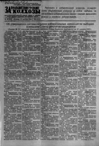 З а б о л ь ш е в и с т с к и е к о л х о з ы 2 4 октября 1950 г . № 86 (1565J О б утверждении состава с е л ь с к и х и збир а тельны х к о м и с с и й по выборам в с ельские Советы депутатов трудящихся Решение № 543 исполкома Мошковского районного Совета депутатов трудящихся от 20 октября 1950 г. Секретарь сельской избира- Н ик ол ай Максимович тельной к о м и с с и и — Г О Р Б А Ч Е В А А н т о н и н а В а с и л ь е в н а — от рабочих и с л у ж а щ и х Орского с е л ь с к о г о Совета. Члены сельской избирательной комиссии: Ж Е Р Е Б Ц О В А Клавдия А л е к с е е вна— от к о л х о зн и к о в колхо з а им. Калинина. С А Ф О Н О В Иван Николаевич — от к о л х о з н и к о в колх о за им. К а л и н и н а . 14. Н о в о - П о р о с с к у ю сел ь ск ую избир ательн ую комиссию . Председатель сельской изби рательной к о м и с с и и — П А Т Р У Ш Е В Н ик ол ай Я к о в л е в и ч— от к о л х о з н и к о в ко л х о за им. С у ворова. Заме с т и тел ь председателя с е л ь с к о й изб ирательной ком и с с и и — К О З О Д А Е В Павел М и х а й л о в и ч — от к о л х о зн и к о в к о л х о з а им. Суворова. Се к [& та рь сельской избирател ьн о й к о м и с с и и — К 0 3 0 Д А Е - В А Л и л и я Павловна— от рабоч и х и с л у ж а щ и х Ново-Порос- с к о г о сельского Совета. Члены сельской избирательной комиссии: Л О Г У Н Ц О В А А н т о н и н а И л ь и н и ч н а — от рабоч их и с л у ж а щ и х Ново-Поросского маслозавода Т Е Й Л О В Павел Понкрато- в и ч — от колхо зников колхоза им. П о к р ы ш к и н а . 15. П лотниковскую сельс к у ю избирательную к о миссию . -от первичной организации Всесоюзной Коммуни стической Партии (большевиков) колхоза «Завет И л ьича » . Заместитель председателя сельской избирательной коми с с и и — Л О Г И Н О В Андрей Данилович— от к о л х о зн и к о в колхо за «Завет Ил ьича » . Се к ре та рь с ель с к ой избирательной к омиссии— Ш А Ц И О Н О К Мария Семеновна— от первичной организации Всесоюзного Л ен и н ск о го К о ммунистического Союза Молодежи колх о за « З а вет Ильича» . Члены сельской избирательной коми ссии : ВО Л К О В А ле к сандр Андрее в и ч — от колхозн иков колх о за «Завет Ил ьича». Л Е П Е Ш К И Н А Ва лен т и н а Степановна— от кол х о з н и к о в ко л х о за «Завет Ильича». 16. Перм скую сельскую избирательную к омиссию Председатель сельской изби рательной к о м и с с и и — К Р Ы Л О В чак“ьной школы А_ _ U п а и т т п а т л /»т горье в на— от первичной органи з а ци и Всесоюз-ного Л енин ского Коммуни стического Союза Молодежи колхоза «Пахарь» . К А Р Я Е Е В Владимир Федоров и ч— от к о л х о з н и к а колхоза « П у т ь к социализму». 17. С т аро -П орос ск ую сельскую избирательную комиссию. рательной к о м и с с и и — С А В Е Л Ь Е В Александр Г е о р ги е в и ч— от первичной органи зации Всесоюзной К о м м у н и с ти ч е ск о й Пар- тли (бол ьш евиков) Томиловского с ельского Совета. Заместитель председателя сельской избирательной коми с с и и — Ф И Л А Т О В Иван Степа нович— от к ол х о зн и к ов колхоз а «Сталь». ■ С е к р е та р ь сельской избира- Председатель сельской изби- тельной к о м и с с и и— М О Р О З О В А рательной к о м и с с и и — И В А Н О В А н н а Т ерен тьевна— от первичной ор га ни зации Всесоюзного Георгий Р ома н ов и ч— от первич ной организации Всесоюзной Коммунистической Па р тил (большевиков ) ко л х о за «Красный С ибиряк» . Заместитель председателя с ель с к ой изб ирательной комисс и и — К У П Р И Е Н К О Павел А л е к сандрович— от колх о зник ов кол хоза «Красный С и б и р я к » . Секре