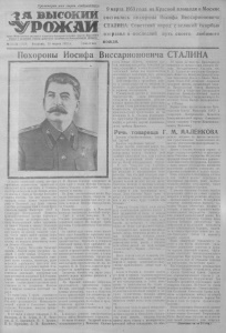 Пролетарии всех стран, соединяйтесь / 1я высокий УРОЖАЙ орган Моишвского районного комитета Коммунистической партии _Советского Союза и районного Совета депутатов трудящихся Новосибирской области^ № 23-24 (1849) В торник, 10 марта 1953 г. ЦценаЮ кош 9 марта 1953 года на Красной площади в Москве состоялись похороны Иосифа Виссарионовича СТАЛИНА. Советский народ с великой Скорбью отправил в -последний путь своего любимого вождя. , ны Иоеи! i Виссарио! овича СТАЛИНА 9 марта советский народ, все про грессивное человечество провожали в последний путь соратника и гениаль ного продолжателя дела Ленина,мудро- •го вождя я учителя Иосифа Виссарио новича Сталина. Три дня подряд, ие- пссякая, текла живая человеческая река в Колонный зал Дома союзов, где был установлен гроб с телом Пред седателя Совета Министров СССР и Секретаря Центрального Комитета Коммунистической партии Советского Союза. Ничем не измерить всю глу бину беспредельной любви трудящих ся нашей Родины к творцу народного счастья товарищу Сталину, их глубо кой скорби по поводу тяжелой утра ты. Сотни тысяч людей прошли перед гробом вождя в эти три дня, давая клятву на верность священному знаме ни Ленина—Сталина. Утро 9 марта. Последние часы про щания... Льются звуки траурных ме лодий. У гроба вождя остаются его родные и близкие, партийный и совет ский актив столицы, министры, руко водители зарубежных братских ком мунистических и рабочих партий. В за ле находятся иностранные правитель ственные делегации, прибывшие для присутствия на похоронах И.В.Сталина, главы посольств п миссий, уполномо ченные своими правительствами пред ставлять их на похоронах. Каждые 2 - 3 минуты меняется почетный ка раул. 10 часов утра. У гроба становятся верные ученики и соратники великого Сталина-тру ководптелн Коммунисти ческой партии п Советского прави тельства. Последние минуты проща ния с вождем. В 10 часов 5 минут товарищи Г. М. Маленков, Л. П. Берия, В. М. Моло тов, К. Е. Ворошилов, И. С. Хрущев, Н. А. Булганин, Л. М. Каганович, А. И. Микоян бережно поднимают на руки гроб с телом Иосифа Виссарио новича Сталина и медленно направ ляготся к выходу. Из Дома союзов выносят венки. Мар шалы Советского Союза, генералы на алых атласных подушечках несут ор дена и медали Иосифа Виссарионови ча Сталина. Вдоль Охотного ряда и Манежной площади выстроился воинский эскорт. Гроб с телом товарища И. В. Сталина устанавливается на артил лерийском” лафете. На крышке гроба фуражка Генералиссимуса Советского Союза. За гробом идут члены семьи покой ного, идут ближайшие соратники вож дя, руководители партии и Советского правительства, маршалы и генералы Советской Армии, идут прибывшие на похороны главы иностранных госу дарств и правительств, возглавляющие правительственные делегации, а также главы дипломатических представи тельств, уполномоченные своими пра вительствами представлять их па по хоронах И. В. Сталина, и другие пред ставители зарубежных стран. Траурная колонна под звуки похо ронного марша медленно движется к Красной площади. На Красной площади собрались представители трудящихся города Москвы, делегации союзных и авто номных республик, краев и областей, i Здесь присутствуют представители ве ликого китайского народа, стран на родной демократии, делегации и пред ставители других стран. На трибуне—дипломатический кор пус. Шзмолвно