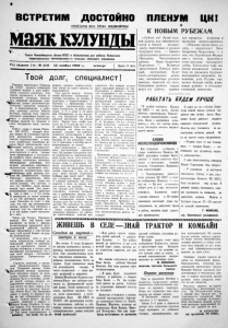 В С Т Р Е Т И М Д О С Т О Й Н О П Л Е Н У М Ц К ! ПРОЛЕТАРИИ В С ЕХ СТРАН, СОЕДИНЯЙТЕСЬ ! маяк галун/ил > Газета Новосибирского обкома КПСС и обпксполнома для районов Купинского территориального производственного колхозно- совхозного управления Год издания 1-й | .VI 1 1 0 1 5 н о я б р и 1 0 0 2 ч е т в е р г Ц е н а 2 коп . Твой долг, с п е ц и а л и с т ! Решения мартовского Пленума Ц К К П С С вызвали небывалым трудовой подъем у всех работников сельского хозяйства. Они горячо включились в борьбу за повышение культуры земледе- ^ • ч н я , внедрение пропашных сево- ^Шфорот ов , резкоо увеличение производства продуктов полеводства и животноводства и добились заметных успехов. Многие колхозы, совхозы зоны территориального управления подали ра- ^ ^ ю р т а о досрочном выполнении " г о д о в ы х заданий по продаже и сдаче государству мяса, молока, яиц. Сейчас, узнав о созыве Пленума Ц К К П С С , который обсудит вопрос об улучшении партийного руководства промышленностью, строительством и сельским хозяйством, труженики деревни берут обязательства орга- ’Ш^нзованно провести зимовку скота, быстро и доброкачественно подготовиться к весне. Запевалами соревнования в большинстве хозяйств стали специалисты— агрономы, зоотехники, механики, ветеринарные работники. Они лучшие наставники, помощники, организаторы тружеников села. Хорошим организатором заре- ломендовала себя агроном кол- им. Дзержинского Тамара Ивановна Андрейченко. Зн ая , что добрые семена , — залог высокого урожая, она пустила в ход три « В И М а » , лично организовала труд людей. Дво зерноочистительные машины работают две, а одна — в три смены. В результате за сутки очищается до 700 центнеров семян. Та мара Ивановна но сидит в конторе, она там, где закладывается основа урожая. Она постоянно с людьми, учит их, помогает нм и в то ж е время строго спрашивает с них. Таких, как Тамара Ивановна, немало. В се они нашли свое призвание на полях и фермах, по-настоящему занимаются организаторской работой, изучают ^ о п ы т передовиков и учат отстающих, всей душой болеют за судьбу производства. К сожалению, есть у нас и такие специалисты, которые организацией работ на производс тв е не занимаются. Засели в теплых кабинетах и оттуда дают письменные распоряжения, что и к а к надо сделать. Составляют инструкции. Превратились в учетчиков. делении привесы низкие,и месяч- пые планы по сдаче свинины не выполняются? Или другой пример. Колхоз нмепи Калинина планировал в октябре поставить на линейку 9 тракторов, а отремонтировал 2. Причина — лягушннскно механизаторы систематически нарушают дисциплину, на работу приходят в 11 и даже в 13 часов дня. Обеспокоило ли это механика тов. Вельского? Нет. В ремонтной мастерской он редкий гость. Вместо того, чтобы приехать на 3—4 дня да как следует организовать труд своих ме- ханизатров, он сидит на центральной усадьбе. Из кабинета руководит ремонтниками и механик колхоза им. Жданова тов. Костров. И вот результат — вместо б тракторов в октябре но отремонтировали ни одного. Долг специалиста — быть боевым организатором производства. Он должен находиться среди людей,учить их передовым приемам труда, а если есть недостатк и— глубоко их вскрывать и принимать моры к устранению. О б щими указаниями и рекомендациями дела не поправишь. Разве можно мириться с тем, что на рядо форм совхоза «Советская Сибирь» еще па
