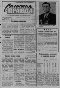 ПРОЛЕТАРИИ ВСЕХ СТРАН, СОЕДИНЯЙТЕСЬ! ОРГАН ДОВОЛЕНСКОГО РАЙКОМА КПСС И РАЙОННОГО СОВЕТА НАРОДНЫХ ДЕПУТАТОВ НОВОСИБЙРСКОИ ОБЛАСТИ Газета выходит с 1934 года. № 37 (6.258)_____ ВТОРНИК, 26 МАРТА 1985 ГОДА. Поздравление С глубоким удовлетворением восприняли трудящиеся нашего района Указ Президиума Верховного Совета СССР о том, что за достижение выдающихся успехов в повышении производительности труда , большой личный в к л а д в увеличение производства зерна и проявленный трудовой героизм комбайнеру совхоза «Центральный» Василию Петровичу КОНДРАТЕНКО присвоено звание Героя Социалистического Труда с вручением ему ордена Ленина и золотой медали «Серп и Молот». Райком КПСС, райисполком горячо и сердечно поздравляют Вас, дорогой Василий Петрович, с присвоением высокого звания Героя Социалистического Труда . Жела ем дальнейших успехов в труде, доброго здоровья, счастья Вам и Вашей семье. Выражаем уверенность, что Вы и впредь будете идти в авангарде социалистического соревнования, показывать образцы героического труда на благо нашей любимой Родины. € наградой Родины! С большой радостью и гордостью восприняли труженики совхоза «Центральный» Указ Президиума Верховного Совета СССР о присвоении звания Героя Социалистического Труда нашему прославленному комбайнеру, кавалеру двух орденов Ленина, коммунисту Василию Петровичу Кондратенко. Этой высокой награды Родины он удостоен за выдающиеся успехи в труде, большой личный вклад в увеличение производства зерна и проявленный трудовой героизм. С молодых лет В. И. Кондратенко связал свою жизнь с землей, хлебом, ежегодно добиваясь высоких показате* лей в соревновании. Его знают в коллективе как скромного, отзывчивого и чуткого человека, наставника молодежи, трудолюбивого работника хорошего и надежного товарища. За это его ценят и уважают у нас в совхозе и райо- неч Дирекция, партийный, профсоюзный комитеты, исполком сельского Совета от имени всех тружеников хозяйства горячо и сердечно поздравляют Василия Петровича Кондратенко с присвоением звания Героя Социалистического Труда, желают дальнейших успехов в труде, доброго здоровья, счастья ему и его семЬе. Честь по труду Коллектив нашей бригады с большим удовлетворением воспринял Указ Президиума Верховного Совета СССР о присвоении звания Героя Социалистического Труда комбайнеру Центрального совхоза ьасилию Петровичу Кондратенко. Жизнь каждого человека украшает труд, жизнь хлеборооа труд красит вдвойне, потому что нет на земле более благородного дела, чем выращивать хлеб. Успехи Василия Петровича общеизвестны: ежегодно он находится в первых рядах битвы за хлеб. Награда, которой он удостоен, еще раз подтверждает, какую заботу проявляют партия и правительство о сельских тружениках. Мы горячо и сердечно поздравляем Вас, Василий Петрович, с заслуженной наградой и надеемся, что Ваш трудовой героизм послужит примером для всех земледельцев района. А. АЗАРОВ, бригадир-полевод Комарьевского совхоза. Одержана крупная победа Дню Победы и предстоящему XXVII съезду КПСС труженики р(айона подготовили свои трудовые подарки — досрочно справились с планом первого квартала производства и продажи 47500 центнеров молока государству. Весомый вклад в трудовую победу внесли труженики Комарьевского, Ильинского, Красногриве н е к о г о , Утянского, Баклушевско-