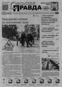 Улыбнись ''весне! РАВНА Доволенский район № 11 (8999) С у б б о т »чцч;* 18 МАРТА 2023 года Основана в 1934 году / Адрес эл. почты: dvlnew1@gmail.com / Газета выходит в субботу 20. 03 21. 03 -1 -8 ЮЗ 715 м/с ЮЗ 7« 4 м/с 23. 03 ЮЗ 7» 4 м/с 24. 03 +4 -8 3 -> 13 м/с 25. 03 3 -> 10 м/с Сводка дежурной части за февраль: более 100 заявлений. ------------------- с. 3 ц р Сезон Взяли проблему Аккуратно ступая по весеннему льду на «карандаш»: депутаты Заксобрания выясняли, как работает реабилитационный сертификат. ------------------- с. 2 Спор у светофора. Кто едет на красный? ------------------- с. 4 19. 03 - 3 Оценку главам МО ставят жители. Стартовали сходы граждан. ------------------- с. 5 Изобретатели сидят за партами. ------------------- с. 6 Строительство Строительная компания ООО «Лидер-Строй» 1 марта приступила ко второму этапу реконструкции моста через р. Баган в с. Волчанка. До конца июня объект будет сдан в эксплуатацию. В настоящее время ведутся работы по сварке пролётных балок и ограждений моста. - г и л и п с н ! . . . . . На фото Татьяны КАПЛИНОЙ: превратившийся в ледовый каток спуск с проезжей части у пешеходного перехода на улице Мичурина. Весна - время, когда дороги и тротуары превращаются в настоящий каток, чередующийся с полосами препятствий в виде нагромождений льда и снега. Главное на скользкой дороге - внимательность и осторожность. Не спешите, избегайте резких движений и смотрите себе под ноги. Будьте внимательны не только к себе, но и к окружающим. У вас не займет много времени помочь пожилому человеку перейти через скользкий участок. Если есть пожилые родственники или соседи, поинтересуйтесь, что им необходимо, предложите свою помощь в покупке продуктов, лекарств, ведь для них прогулка по скользкому льду может обернуться серьёзными травмами. МЧС рекомендует соблюдать следующие правила: - если вам нужно осмотреться, то не делайте это на ходу - остановитесь. Не держите руки в карманах - при падении вы не успеете их вынуть и ухватиться за что-то; - выбирайте свой маршрут так, чтобы не идти рядом с проезжей частью или стенами домов: на кровлях сейчас образуются сосульки; - особенно будьте внимательны при пересечении улицы, делайте это по пешеходным переходам; - спускаясь по лестнице, ставьте ногу вдоль ступеньки, а не поперёк, это положение при падении позволит съехать вниз настолько аккуратно, насколько это возможно в подобной ситуации; - сдепать обувь малоскользящей вам помогут специальные накладки с шипами, а также поролон, лейкопластырь или изолента, приклеенные к подошве; - передвигаться в гололед надо осторожно, ступая на всю подошву, ноги при ходьбе должны быть слегка расслаблены, руки свободны. Если падение неизбежно, специалисты рекомендуют подогнуть ноги в коленях, чтобы снизить высоту падения. Наклониться в сторону, чтобы избежать опасного падения навзничь и падения на вытянутые вперед руки. Нужно сгруппироваться: прижать локти к бокам, втянуть голову в плечи, напрячь мускулы. В момент соприкосновения с землей постарайтесь перекатиться - это существенно снижает силу удара. Эта тактика легко осуществима для молодых и особенно занимающихся спортом людей. А вот пожилым людям в периоды, когда улицы и дороги схватываются коркой льда, лучше, по возможности, пересидеть дома. Если же этой возможности нет, используйте трость с резиновым наконечником и специапьные накладки на обувь для уменьшения скольжения. Родителям с правилами поведени