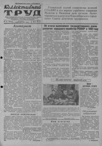 2. „Коллсмтйвиы! труд' 5 февраля 1им года С ОТЧЕТНО-ВЫБОРНЫХ КОЛХОЗНЫХ СОБРАНИИ Без XIX съезд Коммунистической партии перед тружениками сельского хозяйства поставил большие и ответственные задачи. Успешному выполнению их во многом будут способствовать хорошо подготовленные п проведенные отчётные и отчётно- выборные колхозные собрания. 29 января состоялось отчётно- выборное собрание членов артели «Вперёд к коммунизму». В своем докладе председатель правления артели т. Стремоухое сообщил, что полевые работы в 1952 году проведены более организованно, чем в 1951 году, достигнуты успехи в развитии общественного продуктивного животноводства. Однако планы повышения урожайности, роста поголовья скота и увеличения его продуктивности не выполнены. Надой молока на одну фуражную корову составил лишь 1118 литров, по34 яйца вместо 80 запланированных получено в среднем от каждой курицы- несушки, не выполнен план настрига шерсти. На причинах, тормозящих стать артели боле богатой, а колхозникам—зажиточными, следовало бы вдокладе остановиться подробнее. Но т. Стремоухов не вскрыл истинного положения дол,не подверг резкой критике отдельных должностных работников, которые являются конкретными виновниками невыполнения государственных заданий, мало было сказано и о задачах колхоза на 1953 год. Малосодержательным был доклад председателя ревизионной комиссии т. Агеева. Свой отчёт он ограничил зачитыванием акта ревизии за IV квартал 1952 года. А следовало бырассказать присутствующим, деловой критики не было критики в адрес ревизионной комиссии, руковокак комиссия осуществляла борьбу за соблюдение Устава сельхозартели, трудовой п финансовой дисциплины п т. д. —Правление артели,—указал в своем выступлении т. Горбунов,—много выносило хороших решений по животноводству. Но как они выполнялись, мало кого интересовало. Например, осенью было решено до начала стойлового содержания скота подготовить телятник. Но он и сейчас ещё не отремонтирован. Заведующий МТФт. Ощепков п колхозник т. Закрпян критиковали правление за несерьёзное отношение к подбору пастухов, за плохую организации) пастьбы скота. Заведующий фермой т. Обухов п колхозник Хамит Жумартов говорили о слабой трудовой дисциплине. Они отметили, что 48 членов артелп не выработали установленного минимума трудодней. Не работают жены заместителя председателя колхоза т. Горбунова, бригадира полеводческой бригады т. Новак. Некоторые колхозники сейчас отсиживаются дома, хотя работы по подготовке к весне непочатый край. Правление никаких мер не принимает. И всё-такп критика и самокритика на собрании но были развернуты в должной мере. Никто, например, не обмолвился словом о зимне-стойловом содержании скота. А на этом участке не всё благополучно. Плохо то, что на собрании не были всесторонне обсуждены такие важные вопросы, как ликвидация нарушений Устава сельхозартели, подготовка к весеннему севу, распределение натуральных п денежных доходов на трудодни; совершенно дителей полеводческих бригад Нельзя но отметить и тот факт, что собрание некритически подошло к обсуждению выполнения колхозом и МТС взаимных обязательств по заключённым договорам. В адрес МТС не поступило ни одного предложения по улучшению её деятельности. А ведь со стороны Карасукской машинно- тракторной станции были нарушения сроков п
