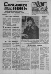 У ПРОЛЕТАРИИ ВСЕХ СТРАН, СОЕДИНЯЙТЕСЬ! ОРГАН КАРАСУКСКОГО РАЙКОМА КПСС И РАЙОННОГО СОВЕТА НАРОДНЫХ ДЕПУТАТОВ НОВОСИБИРСКОЙ ОБЛАСТИ Газета основана 2 октября 1930 г № 2 (7205) ЧЕТВЕРГ, 5 ЯНВАРЯ 1989 г. Цени 3 коп ФЛАГ ТРУДОВОЙ СЛАВЫ поднят в честь передовых 8 доярок Калачинского совхоза ДОРНЕС МАРИИ ПЕТ- 8 8 РОВНЫ, МОЛЬКИНОИ РАИСЫ ЕГОРОВНЫ, КРЕНЦ 8 | ЕКАТЕРИНЫ ФИЛИППОВНЫ, МИХЕИЛИС АМАЛИИ § ° ИВАНОВНЫ, надоивших за минувший год более 30 ц мо- 8 3 лока от коровы. я /ООООООООСОООООООООООООООООООООООООООФООООООООООООООООООООООООООООООООСЮОсихххХХХХ. Строители довольны В начавшемся году строи тели колхоза им. Куйбышева намерены возвести и сдать в эксплуатацию не менее десят ка новых квартир. В эти зим ние дни они полным ходом ведут подготовку к предстоя щему сезону. Специальная бригада запасает на замерз ших займищах камыш и изго тавливает из него панели для сооружения стен будущих домов. Перед бригадой постав В подарок полеводам Хороший и долгожданный подарок получили на днях ме ханизаторы колхоза им. Мичу рина — на центральной усадь бе хозяйства сдан в эксплуа тацию пункт технического об служивания сельхозмашин. Радость полеводов понять легко, ведь ранее все ремонт ные работы они выполняли в приспособленном и тесном по мещении, что постоянно отра жалось на. темпах и качестве подготовки техники. В новом двухэтажном здании ПТО имеется просторный ре Болъ Армении-наша болъ На счет помощи Коллектив дистанции за щитных лесонасаждений вме сте со всем советским народом глубоко воспринял трагедию армянского народа. Трудовой коллектив единогласно решил оказать материальную поддер Идет ягнение маточных отар ' Наша главная задача В овцеводстве я работаю ■- второй год. Сначала приходи лось нелегко, теперь помога ет опыт. В бригаде нашей трое чабанов-братьев. Это и послу жило главной причиной моего прихода сюда. Руководит бри гадой старший — Жумажан Игликов. Он депутат районно го Совета. Обслуживаем 900 овцематок. Сейчас забота особая — на чинается массовый окот. К нему готовились заранее. По сравнению с прошлым годом матка вошла в зимовку упи танной. Старались использо вать удобное для пастьбы овец время. Но пастбищные угодья в колхозе плохие, нужно их окультивировать. Добились сокращения паде жа животных, однако есть и свои трудности. Одна из них — недостаток помещений. В кошарах наблюдается боль шая скученность. Если учесть; что поголовье нынче увеличено на две сти овцематок, то сохра нить его будет сложней, чем в прошлом году. К тому же именно сейчас нужны качест-. лена задача выпустить за зи му не менее 4 тысяч таких панелей. Несмотря на насту пившие холода в тайге продол жается заготовка пиломатериала. Активно запасаем и мест ный лес, на хоздвор уже под везено несколько десятков ку бометров строевой осины. С. ТРУСОВ, строймастер колхоза им. Куйбышева. монтный зал площадью свыше 400 квадратных метров, токар ный, слесарный, топливный, аккумуляторный и сварочный цеха. На втором этаже — красный уголок, душ и сауна. Сейчас в цехах устанавлива ются станки и другое обору дование. На полную мощь ПТО заработает в третьей де каде января, но уже в эти дни в большом зале началась постановка на ремонт первых аг регатов. - С. БАРАННИКОВ, председатель колхоза им. Мичурина. жку — перечислить дневной заработок в фонд помощи. На счет 904059 поступило 700 рублей. Н. ЕДАПИНА, ин