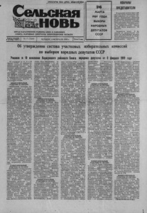 ПРОЛЕТАРИИ ВСЕХ СТРАН, СОЕДИНЯЙТЕСЬ! — * ------------------------------- ------------------------------- -*г- Сельская ШьНОВЬ ОРГАН КАРАСУКСКОГО РАЙКОМА КПСС И РАЙОННОГО СОВЕТА НАРОДНЫХ ДЕПУТАТОВ НОВОСИБИРСКОЙ ОБЛАСТИ 2в МАРТА 1989 ГОДА ВЫБОРЫ НАРОДНЫХ ДЕПУТАТОВ СССР Газета основана 2 октября 1930 г. № 17 (7220) ЧЕТВЕРГ, 9 ФЕВРАЛЯ 1989 г. Цена 3 коп. ИЗБРАНЫ ПРЕДСТАВИТЕЛИ В трудовых коллективах рай она и по месту жительства про шли собрания, на которых про ходило выдвижение делегатов на окружное предвыборное соб рание по обсуждению кандидатов в народные депутаты СССР по Татарскому территориаль ному избирательному округу Хе 236. Всего выдвинуто 82 делегата. Выдвинуто также 6 делегатов на предвыборное соб рание по обсуждению кандида тов в депутаты СССР по нацио нально-территориальному из бирательному округу № 21. Об утверждении состава участковых избирательных комиссий по выборам народных депутатов СССР Решение № 19 исполкома Карасукского районного Совета народных депутатов от 6 февраля 1989 года На основании ст. ст. 21 и 26 Закона СССР «О выборах на родных депутатов СССР» ис полнительный комитет Кара сукского районного Совета на родных депутатов решил: Утвердить участковые изби рательные комиссии общие для выборов народных депута тов СССР от территориального и национально-территориально го избирательных округов в следующем составе: ИЗБИРАТЕЛЬНЫЙ УЧАСТОК № 130/1575 СМЕТАНИН Геннадий Сы- соевич, директор — от трудо вого коллектива Карасукского элеватора; РЕБРОВА Людмила Павловна, начальник отдела кадров — от трудового коллек тива Карасукского элеватора; ПАВЛЮЧЕНКО Люция Аха товна, кассир — от трудового коллектива Карасукского эле ватора; ШАВАЕВА Светлана Семеновна, техник-лаборант — от трудового коллектива Кара сукского элеватора; МОРЕВА Антонина Степановна, органи затор внеклассной работы — от трудового коллектива сред ней школы № 1; КОРОТКОВА Татьяна Анатольевна, пионер вожатая — от трудового кол лектива средней школы № 1; НИКИТЕНКО Надежда Ни колаевна, учитель — от трудо вого коллектива средней шко лы № 1; ФОМЕНКО Татьяна Михайловна, учитель — от тру дового коллектива средней школы Хе 1; БАБЕНКО Нико лай Антонович, плотник — от трудового коллектива ХДСУ «Карасукский»; ШАИМУХА- МЕДОВА Ильфира Салаховна, экономист — от трудового кол лектива ХДСУ «Карасукский»; МУКОВОЗ Елена Николаевна, воспитатель — от трудового коллектива ясли-сада № 3; ТКАЧЕНКО Анатолий Василь евич, компрессорщик — от со вета трудового коллектива гос- промхоза «Южноозерный»; КИРИЛИШИНА Мария Вик торовна, заведующая холодиль ником — от совета трудового коллектива госпромхоза «Юж ноозерный»; ТРЕГУБОВ Сер гей Иванович, слесарь-кузнец — от совета трудового коллектива госпромхоза «Южноозер ный». ИЗБИРАТЕЛЬНЫЙ УЧАСТОК № 131/1576 ЯКУБЕНКО Тамара Кузьми нична, наполнитель ГНС — от трудового коллектива треста «Карасукмежрайгаз»; ГОРШЕ НИНА Галина Михайловна, ин женер — от трудового коллек тива треста «Карасукмежрай газ»; ЗАКРОЕВА Людмила Васильевна, диспетчер — от трудового коллектива треста «Карасукмежрайгаз»; ЕЩЕН КО Александр Николаевич, га- зоэлектросварщик — от трудо вого коллектива ДРСУ; Крав ченко Григорий Дмитриевич, оператор — от трудового кол лектива ДРСУ; ШТОДА Ва лентина Григорьевна, ст. бух галтер — от трудового коллек тива опытного мехлесхоза; КОЗ ЛОВА Вера Михайловна, ху дожник