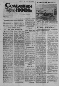 ПРОЛЕТАРИИ ВСЕХ СТРАН, СОЕДИНЯЙТЕСЬ! ОРГАН КАРАСУКСКОГО РАЙКОМА КПСС И РАЙОННОГО СОВЕТА НАРОДНЫХ ДЕПУТАТОВ НОВОСИБИРСКОЙ ОБЛАСТИ I амта основана 2 октября 1930 г. / Позывные жатвы Порадовала «кулундинка» С уборки озимых хлебов на чалась у полеводов Калачин ского совхоза жатва -89. Хоро шим урожаем порадовала но вая в районе пшеница, «кулун- Динка» алтайской селекции. Ее опытное поле на Павловском Слово-участнику страды ДО КАЖДОГО ЗЕРНЫШКА Вот и пришла в степную Ку- лунду очередная уборка уро жая, являющаяся венцом годо вого рабочего цикла земледель цев. Гулом комбайнов и авто машин огласились поля колхо зов и совхозов района, в том числе и нашего хозяйства. Сложным и напряженным вы дался нынешний сезон для ка- расукских хлеборобов. Мало снежная зима, ранняя весна, засушливое жаркое лето со здали острый дефицит почвен ной влаги, отрицательно ска завшийся на росте и развитии всех без исключения культур. Чтобы хоть как-то снизить его воздействие на формирование урожая, пришлось приложить немало дополнительных уси лий, с особой тщательностью и своевременно выполнять каж дый прием весенне-летнего аг рокомплекса. Тем не менее прошлогодних результатов нын че не повторить. А в предыду щем сезоне коллектив нашего подрядного звена добился за метного успеха, произведя ва ловой продукции на каждого механизатора на 47 тысяч рублей, что явилось вторым показателем в районе. Наше звено работает второй год. Вместе со мной в него входят Алексей Семенченко, Иван Головач, Владимир Аку лов и Александр Поздняков. На пятерых приходится без малого 2200 гектаров земли, на которой возделываются пше ница, овес, озимая рожь, есть полтысячи гектаров пара. Вес ной как следует закрыли вла гу; в срок с 19 по 31 мая по сеяли яровые колосовые. Всхо ды получились дружными и ровными, хорошо пошли в рост. Но жара и сУ™ь сделали свое неблагодарное дело, све дя на нет усилия полеводов — примерно на 800 гектапах. то есть практически на половине всех посевных площадей, сго ревшие хлеба можно списывать. Лишь отдельные участки, над которыми летом выпадал мало мальский дождь, дадут по 10 — 11 центнеров с гектара. Мы сеяли два сорта пшени цы — «саратовскую-29» и «но- восибирскую-81 », В одинако вых условиях последняя вы глядит заметно предпочтитель ней. она лучше перенесла же стокую засуху. Поэтому мы сде лали вывод: «новосибипской- 81» необходимо сеять больше, что будет гарантировать даже в таких неблагоприятных усло виях более высокий намолот. К жатве звено приступило 26 июля, начав ее с косовицы озимой ржи. За пару Дней Алексей Семенченко скосил ее, а затем Иван Головач и Вла димир Акулов обмолотили. Урожай ржи нас порадовал — № 95 (2797) ВТОРНИК, 8 АВГУСТА 1989 г. Цена 3 >оп отделении дало с каждого из 16 гектаров по 21 центнеру полновесного зерна, что явля ется для такого острозасушли вого года прекрасным показа телем. Весь собранный урожай намечается использовать на с каждого из полсотни гектаров взяли по 15 центнеров зерна, что для нынешнего года весь ма неплохо. Здесь мы сделали еще один вывод — озимыми надо заниматься более серьез но, отводить под них куда бо льшие площади. Предложили агрономической службе весь полученный урожай пустить на семена, засеять ими в конце лета уже несколько сот гек таров. К уборке подготовились свое временно. Определили рабочий план. ч я и Ааядее# будем ва лить зерно