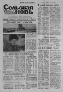 ПР8ЛЕТАРМИ ВСЕХ СТРАН, СОЕДИНЯЙТЕСЬ! ОРГАН КАРАСУКСКОГО РАЙКОМА КПСС И РАЙОННОГО СОВЕТА НАРОДНЫХ ДЕПУТАТОВ НОВОСИБИРСКОЙ ОБЛАСТИ Навстречу XXVIII съезду КПСС В окружной избирательной комиссии Газета основана 2 октября 1930 г, СОХРАНЯЮТ ВЛАГУ АРЕНДАТОРЫ НА ЗАВЕРШАЮЩЕЙ СТАДИИ ЗИМОВКИ Заканчивается период стой лового содержания обществен ного стада. Для животноводов района он выдался очень труд ным из-за слабой кормовой ба зы. Много сил и стараний при шлось приложить для того, чтобы не допустить резкого снижения продуктивности ско та. Однако шесть хозяйств из восемнадцати не смогли спра виться с выполнением плана первого квартала реализации молока государству. В колхо зе им. Калинина и нынче за метно резкое отставание надо ев к уровню прошлого года. Здесь получают на 3,3 кг мо лока меньше. В большинстве хозяйств добиваются прибавки в надоях. Совсем немного времени ос тается до перевода скота на пастбища. Оставшийся пери од не менее ответственный на РЕЗУЛЬТАТЫ ПОВТОРНОГО ГОЛОСОВАНИЯ по выборам депутата Кара- сукского городского Совета на родных депутатов по избира тельному округу № 7, состояв шегося 20 апреля 1990 года. КАНДИДАТЫ В ДЕПУТАТЫ Дехтяренко Василий Василь евич — число голосов «за» — РЕЗУЛЬТАТЫ ПОВТОРНОГО ГОЛОСОВАНИЯ по выборам депутата Кара сукского районного Совета на родных депутатов по избира тельному округу № 14, состо явшегося 20 апреля 1990 года. КАНДИДАТЫ В ДЕПУТАТЫ Бобрышев Александр Ивано № 52 (7411) ЧЕТВЕРГ, 26 АПРЕЛЯ 1990 г. Цена 3 коп. завершающей стадии зимовки. Обязателен регулярный моци он животных, важно принять все меры, чтобы не допустить ослабления животных, снизить „возможность их травматизма перед выходом на выпаса. Уже сейчас надо позаботиться о зе леном конвейере. В эти дни животноводству должны уде лять особое внимание, изыски вать резервы заготовки кор мов, которые так необходимы нынче До появления первого травостоя. Ведь в некоторых хозяйствах из-за отсутствия кормов придется выводить ста да на луга намного раньше. Забота о тружениках в этот период также должна быть первоочередной. У нас в рай оне есть хорошие тому приме ры, на летних доильных площадках созданы все усло вия для плодотворной работы. 119, «против» — 168, число недействительных бюллетеней — 2. Куксов Владимир Федорович — число голосов «за» — 148, «против» — 139, число не действительных бюллетеней — 2. вич: число голосов «за» — 218, «против» — 194. Посаженников Сергей Вален тинович: число голосов «за» — 194, «против» — 218. По итогам повторного голо сования депутатом районного Приехав на ферму № 2 (с. Сорочиха) совхоза им. Дзер жинского, мы встретились с управляющим Я. М. Прилуц- ним, у которого поинтересова лись, как проходят весенне-по левые работы. — Агрегаты в поле, — от ветил он. — Особенно работа ладится в звене Николая Мар кова. Вместе с ним работают его брат Виктор и старейший механизатор хозяйства Дмит рий Степанович Таран со сво ими сыновьями Николаем и Сергеем. У них уже сложился сплоченный коллектив. В этом году перешли на полную, арен ду. Это значит, помимо закреп ленных за ними более 1200 гектаров земли,, они взяли на полное обеспечение дойный гурт 200 голов, который об служивают шесть доярок. На снимках: прибивка влаги; Н. Таран. СВЕДЕНИЯ О СУТОЧНЫХ НАДОЯХ МОЛОКА В ХОЗЯЙСТВАХ РАЙОНА НА 24 АПРЕЛЯ 1 гр. — надой от коровы в сутки (кг), 2 гр. — ± к 1989 г. им. Тельм