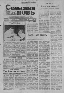 ПРОЛЕТАРИИ ВСЕХ СТРАН, СОЕДИНЯЙТЕСЬ! ОРГАН КАРАСУКСКОГО РАЙКОМА КПСС И РАЙОННОГО СОВЕТА НАРОДНЫХ ДЕПУТАТОВ НОВОСИБИРСКОЙ ОБЛАСТИ ВТОРНИК, 3 ИЮЛЯ 1990 г. Цена 3 коц. азета основана „ _ п октября 1930 г № 79 (7438) На злобу дня После дождя — сев! О ЛЕТНИХ ПОСЕВАХ РАПСА, ОВСА И ДРУГИХ КУЛЬТУР. Директор совхоза Калинов- і ский Ф. И. Шаповал рекомен- ? довал мне встретиться с пе- % редовой телятницей совхоза 3 Тамарой Григорьевной Колес- 1 никовой. Доехал до ее дома, й а у дома девочка скачет на § скакалочке. > — Вам Тамару Григорьев- > ну? Так это моя бабушка — '} отвечает она. I — Вот повезло, помоги | найти мне ее. | Нашли мы Тамару Григо- 3 рьевну на ферме, познакоми- | лись, разговорились. I — Скоро на пенсию идти. | 15 лет уже с телятами во- | жусь. Забот с ними хватает, I ведь больше сорока их, — 3 рассказывает Т. Г. Колесни- ОТКРЫЛИ МУЗЕЙ По установившейся тради ции 22 июня — в день нача ла Великой Отечественной вой ны в селе Благодатное прохо дил митинг памяти. В нем при няло участие почти все населе ние, в том числе ветераны войны, семьи погибших воинов, пионеры и школьники. После митинга состоялось открытие музея, расположившегося в одном из кабинетов средней школы. Право разрезать ленту Будьте осторожны Три беды — на пятницу Только беспечность и бесконтрольность за своими действи ями привели к дорожным происшествиям, случившимся в минув- » ую пятницу. Некоторые завершились трагически. За истекшую неделю про изошел всплеск дорожно-тран спортных происшествий. Их тик пришелся на пятницу 29 июня. Так, в 12. 45 на пе ресечении ул. Октябрьской — Молодежный переулок мото циклистом сбит велосипедист Карась Г. А. От полученных травм он скончался. По данно му происшествию ведется рас следование. В 17.30 на пересечении ул. Д. Бедного — Молодежный пе реулок водитель мотоцикла «Минск» Соколов В., 1968 го да рождения, выезжал со вто ростепенной дороги на глав ную, не пропустил грузовой автомобиль, двигавшийся по гдавной улице, допустил стол нова. — Утром в 8 утра ну- ; жно их напоить, только что ; родившихся, из соски, а по-; старше — приучаю пить из ведра. Работа у нее своеобразная, как у нянечки и трудится добросовестно на, протяжении многих лет* „руд ее неодно кратно отмечался премиями, подарками, грамотами. Внучка Ира тут же с нами. — Пойдешь после школы к бабушке на ферму рабо тать? — спрашиваю Иру. Она согласна. Но в жизни столь ко интересного. И еще не раз Ира будет менять профессии пока вырастет. Текст и фото В. КОЛЕНО. предоставили единственной на селе женщине-ветерану войны Глафире Семеновне Василь евой В создании и оформле нии открывшегося музея ак тивное участие принимали ве теран войны и труда И. В. Мартыко и учитель истории Р. Д. Мыльникова. В. ЛЕЛЬ, секретарь парторганизации колхоза им. Тельмана. кновение. От полученных травм скончался. Около 18 час. в дежурную часть ГАИ была заявлена кра жа мотоцикла «Восход». Г-н Матюх, укравший мотоцикл, в состоянии алкогольного опья нения на дороге, ведущей к городской свалке, напротив асфальтного завода грубо на рушил правила дорожного дви жения. Допустил столкновение с автомобилем «Москвич». С открытым переломом правой голени госпитализирован. Просим водителей личного и общественного транспорта быть предельно внимательными на дороге. В КАРАСЬ, начальник ГАИ. ИДЕТ СТРИЖКА Ответственная пора началась у овцеводов колхоза им. Куй бышева. Одним
