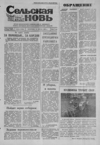 ПРОЛЕТАРИИ ВСЕХ СТРАН, СОЕДИНЯЙТЕСЬ? ОРГАН КАРАСУКСКОГО РАЙКОМА КПСС И РАЙОННОГО СОВЕТА НАРОДНЫХ ДЕПУТАТОВ НОВОСИБИРСКОЙ ОБЛАСТИ ОБРАЩЕНИЕ Газета основана 2 октября 1930 г. На пороге жатвы ЗА ПОМОЩЬЮ... ЗА КОРДОН УБОРКА ХЛЕБОВ НАЧАЛАСЬ, НО ГОТОВНОСТЬ К НЕИ НИЗКАЯ. ЭТО ДОЛЖНО БЕСПОКОИТЬ НЕ ТОЛЬКО МЕХАНИЗАТОРОВ КОЛХОЗА «МАЯК ИЛЬИ ЧА». ЗАСЕДАНИЕ ПРЕЗИДИУМА РАЙСОВЕТА На просторы степной Ку- лунды пришла очередная убо рочная страда. В ряде хо зяйств района ведется жатва озимых зерновых, а букваль но через считанные дни кара- сукекие полеводы приступят к работам и на яровой хлебной ниве. Как встречают страду зем ледельцы колхоза «Маяк Иль ича?» Надо отдать должное на шим механизаторам, которые, несмотря на острый дефицит времени, сумели хорошо под готовить уборочную и перера батывающую технику. Еще зи мой отремонтировали весь комбайновый парк. Заблаго временно отладили; на току все три ЗАВа, установив к тому же на одном из них пневмосе паратор, что позволит более качественно очищать зерно. Позаботились и о создании не обходимого запаса горюче-сма зочных материалов, чтобы не было перебоев в работе убо рочной техники. И тем не менее чувство оза боченности не покидает михай ловских земледельцев. Преж де всего тревожит ставшая уже хронической острая нехватка запчастей, в первую очередь к силосоуборочным комбайнам. По этой причине из 6 машин на сегодня готовы к выходу в поле пока 4, а остальные — это КСС-2,6 Н. Крамского и КСК-100 Н. Тихонова — за стряли в ремонте на неопре деленное время. Нет на кол хозном складе ни валов при вода режущего аппарата, ни коробок привода ведущего ва ла, ни транспортеров хедера, ни измельчающих ножей. Со бираем недостающее, что на зывается, с утиля, по возмож ности реставрируем, но особой надежды на такую «самодея тельность» нет. Неизвестно, где брать зап части. Нет их в районном аг- роснабе, нет даже в области. Ни с чем вернулись мы и с Пойдет зерно отборное Уже нынешней осенью у по леводов колхоза им. Калинина отпадет проблема хранения и переработки зерна. Позволит это новый комплекс, строите льство которого завершается на току. Комплекс включает ЗАВ-40 и ангар площадью около 2,2 тысячи квадратных метров, который способен вместить до 20 тысяч центне ров зерна. Здесь, под надежной кры шей, прошедшая первичную очистку продукция полей бу Задание перевыполнили Дружно и слаженно ведет зеленую жатву коллектив бри гады № 1 колхоза им. Мичу рина. Об этом говорит тот факт, что кормодобытчики не только справились, но и пере выполнили задание месячника № 91 (7450) ВТОРНИК, 31 ИЮЛЯ 1990 г. Цена 3 коо. крупной технической ярмарки, проходившей недавно в Ново сибирске. Может быть, надо просить помощи за границей? Ведь на Западе, как свиде тельствуют средства массовой информации, само понятие «де фицит» почти неведомо. Мож но было бы прикупить там и кое-что к грузовым автомоби лям, к примеру, коленвал, поршневую группу, блок дви гателя к ГАЗ-53 — таких ма шин у нас простаивает две, а ведь им возить скоро продук цию нового урожая. Как я уже отметил, все зер ноуборочные комбайны отре монтированы, однако «12 из 18 «степных кораблей» могут не выйти в поле, так как сто ят без аккумуляторов. А 5 из них, к тому же, не имеют хо зяев, механизаторов в колхозе не хватает. По решению ис полкома районного Совета на родных депутатов (№ 132 от 4 июля с. г.) в качестве помо щи кол