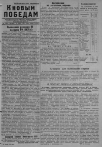 Пролетарии всех стран, соединяйтесь! К Н О В ЫМ П О Б ЕДАМ Воскресник по заготовке кормов Орган Ноченевского районного комитета ВКП(б) и районного Совета депутатов трудящихся, Новосибирской области 53 (1587? Четверг, 5 июля 1951 года (цена 15 ноп. Выполним решения III пленума РК ВКП(б) района развертывается ире- 22 районная партийная кон ференция в своём постановле нии по отчёту райкома пар тии дала конкретную програм му районной партийной органи зации борьбы за решение глав- 9 ной задачи в сельском хозяй стве— повышение урожайности всех сельскохозяйственных культур, увеличение валового сбора зерновых и технических культур, увеличение поголовья общественного скота и повы шение его продуктивности. Со стоявшийся 3 июля I I I пле- Г -чум РК ВКП(б) рассмотрел вопрос о выполнении поста новления 22 районной пар тийной конференции. В своём постановлении I I I пленум отметил, что постанов ление районной партконферен ции в деле решения главной задачи в сельском хозяйстве в районе выполняется неудов летворительно. Бюро РК ВКП(б), райиспол ком, первичные партийные ор ганизации допустили серьёз ные ошибки в работе по руко в о д с т в у колхозами, МТС и совхозами. Не обеспечили про ведение весеннего сева в сжа тые сроки и тем самым не создали условий для получе ния высоких урожаев на кол хозных и совхозных нолях. Пленум отметил, что пер вичные парторганизации, рай ком ВКП(б), райисполком не сделали из этого серьёзных выводов и дальнейший комп лекс летних сельскохозяйст венных работ также органи зуется крайне неудовлетвори тельно. В прошлую зимовку в кол хозах-района допущен значи тельный отход поголовья обще ственного скота из-за необес печенности кормами и плохо го ухода. Трёхлетний план развития поголовья большинством кол хозов далеко не выполнен. Однако многие руководители «^колхозов, работники райсель- хозотдела и отдела сельского и колхозного строительства, директоры МТС и совхозов не обходимых мер к выполнению плана развития поголовья и созданию тёплой п сытной зи мовки скоту не принимают. План контрактации и за купки скота колхозами для пополнения общественного ста да не выполняется, строитель ство и ремонт животноводче ских построек проходит край не неудовлетворительно, сено кошение п силосование кор мов в колхозах и совхозах ступно медленно. Партийно-политическая ра бота в районе находится в запущенном состоянии. Многие первичные партийные органи зации, сельские Советы не развернули массово-политиче ской работы с массами, не мобилизовали трудящихся на ликвидацию создавшейся угро зы неблагоприятной зимовки для общественного животновод ства. I I I пленум РК ВКП(б) по требовал от бюро РК БКП(б), от райисполкома и первичных партийных организаций реши тельно изменить стиль своего руководства колхозами, МТС и совхозами, обеспечить без условное выполнение решений 22 районной партконференции. Пленум обязал бюро РК ВКЩб) и первичные парторга низации развернуть широкую массово-полйт-йческую работу и социалистическое соревнова ние за успешное решение хо зяйственно-политических за дач в районе. Повысить требовательность к руководителям советских и хозяйственных организаций и их ответственность за свое временное выполнение госу дарственных плановых заданий. Задача районной партийной организации, всех советских и земельных органов района сейча