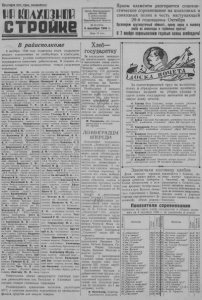 III) ст п ршо ий ки ие Орган Краснозерского райкома ВКП(б) и райисполкома с. Краснозерск, Новосибирской области № 53(1014) 6 октября 1946 г. Цена 15 коп. Ярким пламенем разгорается социали стическое соревнование на колхозных и совхозных полях в честь наступающей 29-й годовщины Октября Организуем круглосуточный обмолот, сушку зерна и вывозку хлеба на элеваторы и глубинные пункты! К 7 ноября перевыполним годовые планы хлебосдачи! В райисполкоме 6 октября 1946 года подведены итоги социалисти ческого соревнования на хлебоуборке и хлебосдаче. Выполнившие условия социалистического соревнования награждаются грамотами райисполкома. В порядке по ощрения продаются промышленные товары следующим товарищам: Коваленко К. М-— косарю колхоза „Сигнал* продаются га лоши и брюки; Хохуле В. П. — косарю колхоза им. Кагановича— полупальто и галоши; Мороза- 1 ву П. Д.—косарю колхоза „Юный < ленинец“—галоши и телогрейка; Дуловой Л. В.— косарю колхо за „Юный ленинец“—галоши, юбка и полупальто; Масюк П. Т. —комбайнеру Мохнато-Логовской М1С—галоши и брюки; Бойчен ко Г. К.— комбайнеру Запруди- хинского совхоза—галоши и по лупальто; Капранову Г. И - комбайнеру Запрудихинского сов хоза—комбинезон, брюки; Роемо М. М. —работающей на отгрузке зерна от комбайна в Запруди- хинском совхозе—юбка, галоши, платье; Лисогор А. Я .— комбай неру Хабаровского совхоза—га лоши, брюки; Панкратьеву Г. И.—трактористу Хабаровского совхоза—телогрейка, галоши; Кривулиной А М.— рабочей Ха баровского совхоза—галоши, пла тье; Высочину И. В —комбай неру Ждановской МТС—брюки, галоши, сорочка; Гуртовому А. П.—комбайнеру Ждановской МТС—полупальто, галоши, сороч ка; Демьяненко Е. Р.— комбай нерке Ждановской МТС—платье, галоши, комбинация; Семка П. К. —косарю колхоза „Красный партизан“—полупальто, галоши; Дириенно И. Л.— косарю кол хоза „Красный партизан“—курт ка, галоши; Вертегел С. Н.— косарю колхоза „Красный парти зан“—шаровары и ботинки; Пе- хеиьно С В —косарю колхоза „13-й Октябрь“, Орехо Логовско- го сельсовета,—брюки и ботинки; Лавлык И. Н,—-комбайнеру Мох нато-Логовской МГС — галоши, куртка; Яковлевой А. Н .—зав. током Запрудихинского овцесов хоза—галоши, комбинация, пла тье; Бондаренко П.— возчику зерна колхоза „Груд*—платье, куртка; Бражнинову Т,— коса рю колхоза „Труд“—полупальто, ботинки; Исакову М. В,— брига диру полевой бригады—полу пальто, юбка, сорочка; Безух Г. М. —косарю колхоза им. Ка линина—полупальто, ботинки; Чернухину И. С.— комбайнеру Краснозерской МТС—галоши, брюки, комбинезон; Нога К. —комбайнеру Мохнато-Логовской МТС—полупальто, брюки, ботин ки; Кравченко Я. В.— комбай неру Запрудихинского совхоза— полупальто, галоши; Курохти- ной М. С- —звеньевой на очист ке зерна Запрудихинского сов хоза—платье, сорочка; Ляшенно А ,—комбайнерке Мохнато-Логов ской МТС—юбка, галоши, сороч ка; Подольскому Г. —комбайне ру Мохнато-Логовской МТС—гало ши, куртка; Печерице Я.— ком байнеру Мохнато-Логовской МТС —шаровары, галоши; Липовому П. —комбайнеру Мохнато-Логов ской М'ГС—галоши, брюки; Зуб ко Г. Е.— комбайнеру Краснозер ской МТС—полупальто, брюки, галоши; Губенко П. Е. зав. то ком колхоза им. Шмидта—гало ши, куртка; Пусь П. Е —коса рю колхоза „Сигнал*—брюки, галоши; Ломтеву М. И.—коса рю колхоза им. Фрунзе—галоши, сорочка; Кириченко Л. Т.— ко сарю колхоза им. Кагановича— п