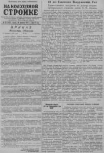 Пролетарии всех стран, соединяйтесь! НА КОЛХОЗНОЙ СТРОЙКЕ Орган I»раснозерского райкома Коммунистической партии Советского Союза и районного Совета депутатов трудящихся, Новосибирской области №26 (2387) | Среда, 26 февраля 1958 г» || Цена 15 коп, ■Н111— И1 щ >11И1щII и I щ щншштяттяятшшяяшятяяяшттятяшт»швяттшшшшвтяшяшяштшшт тттшаят П Р И К А З Министра Обороны 23 февраля 1958 года Л» 32 г. Москва Товарищи солдаты и матросы, сержанты и старшины! Товарищи офицеры, генералы и адмиралы! Сегодня советский народ и его доблестные воины торжест венно празднуют сороковую годовщину Советской Армии и Во енно-Морского Флота. Созданные Коммунистической партией во главе с великим Лениным для защиты первого в мире социалистического госу дарства, Советские Вооруженные Силы прошли героический бо евой путь. Они выросли и закалились в ожесточенных битвах с врагами, не раз посягавшими на свободу и независимость на шей Советской Родины. В суровые годы гражданской войны молодая Красная Армия наголову разгромила полчища интервентов и белогвардейцев, отстояла завоевания Великой Октябрьской социалистической ре волюции. Беспримерный подвиг совершили Вооруженные Силы СССР в Великой Отечественной войне. Совместно с армиями других стран антигитлеровской коалиции они нанесли полное пораже ние фашистским захватчикам, сыграв при этом решающую роль в разгроме сильного и коварного врага. Советские Вооруженные Силы избавили нашу Родину от угрозы фашистского порабоще ния, помогли народам Европы освободиться от гитлеровской ок купации, с честью выполнили свою благородную освободитель ную миссию. Источником могущества наших Вооруженных Сил является советский общественный и государственный строй, нерушимое единство народа и армии, безграничная преданность советских людей своей социалистической Родине. Несокрушимая сила нашей Армии и Флота состоит в мудром руководстве Коммунистической партии. На всех этапах развития Советского государства наша Партия проявляла неустанную за боту о строительстве и укреплении Советских Вооруженных Сил. Новым ярким свидетельством заботы Партии о Вооруженных Си лах являются исторические решения октябрьского Пленума ЦК КПСС, направленные на улучшение партийно-политической ра боты среди личного состава, на дальнейшее повышение боевой готовности Армии и Флота. Сороковую годовщину своих Вооруженных Сил наша стра на отмечает в обстановке выдающихся побед во всех областях коммунистического строительства. Быстрыми темпами растет с о циалистическая индустрия, неуклонно идет в гору сельское хо зяйство, новыми достижениями радуют Отчизну деятели науки и техники, с каждым днем повышается благосостояние трудящих ся. Идя навстречу выборам в Верховный Совет СССР, советские люди еще теснее сплачиваются вокруг родной Коммунистической партии и ее ленинского Центрального Комитета. Претворяя в жизнь величественную программу строительства коммунизма, намеченную XX съездом КПСС, советский народ, Партия и Правительство настойчиво борются за укрепление ми ра и Дружбы между народами, последовательно проводят в жизнь ленинскую миролюбивую внешнюю политику. Эта политика на ходит полную поддержку социалистических стран, миролюбивых народов всего земного шара. В то же время правящие круги империалистических госу дарств упорно противод