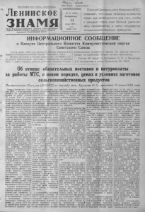 П р о л е т а р и и в с е х ст р а н , с о е д и н я й т е с ь ; Ленинское З Н А М Я Орган Мошковского районного комитета Коммунистической партии Советского Союза и районного Совета деп утат ов трудящихся Новосибирской области Пленум Ц ен тр а л ьн о го Комитета КПСС отмечает, что наш е с е л ь ск о е хозяйство имеет все возможности для того, чтобы с каждым годом е щ е бо л ьш е у в е л и ч и вать производство и сдачу государству с е л ь ск охо зяй ствен ны х продуктов. № 79 (2489) В о с к р е с е н ь е , 2 2 и ю н я 1958 г Цена 15 коп ИНФОРМАЦИОННОЕ СООБЩЕНИЕ о Пленуме Центрального Ком итета Коммунистической партии С о в ет ск о г о С о ю з а 17— 18 июня 1958 года состоялся Пленум Центрального Комитета Коммунистической партии Советского Союза. Пленум заслушал и обсудил док лад тов. ХРУЩЕВА II. С. об отмене обязател ьны х поставок и натуроплаты за р аб о ты МТС, о новом порядке, ценах и у сл о в и я х заготовок с е л ь с к о хозяйственных продуктов и принял по док ладу соответствующее постановление, которое сегодня публикуется . Пленум ЦК избрал т т . Подгорного II. В. и Полянского Д. С. кандид атами в члены Президиум а ЦК КПСС. Об отмене обязательных поставок и натуроплаты з а работы МТС, о новом порядке, ц енах и условиях заготовок сельскохозяйственных продуктов Постановление П л е н у м а Ц К КПСС по д о к л а д у тов. Х р у щ е в а Н. С., принят ое 18 ию ня 1958 года П л е ну м Центрального К о м и тета КПСС с удовлетворением о тмечает , что ра зработанные п а р т и е й на основе решений X X с ъ е з д а КПСС и го р я ч о одобренные всем народом меры по перестрой ке у п р а в л е н и я промышленностью и с т р о и т е л ь с твом , дальнейшему р а з в и т и ю к о л х о з н о г о строя и р е о р г а н и з а ц и и МТС усп еш н о пре твор я ю т с я в ж и з н ь и дают свои з а мечательные р е з у л ь та ты . Социа л и с т и ч е с к а я промышленность п п р е ж д е всего т я ж е л а я и н д у с т р и я р а зв и в аю т с я вы со ким и темпами , выполняя и перевып ол н я я государс твенные п л а ны. В этом проявляе т ся тор-' ж е с т в о ле н и н с к о й п о л и т и к и п а р т и и , направленной н а в с е мерное укре плен ие экон ом и че с к о г о м о г ущ е с тв а ст раны, на т е х н и ч е с к и й прогресс во всех о т р а с л я х народного х о з я й с т в а и н е у к л о н н ы й подъем б л а г о с о с то я н и я т р у д я щ и х с я . Социал и с т и ч е с к а я и н д у с т р и я , я в л я я с ь ведущей силой в н а р о д ном х о зя й с т в е , обеспечила т е х н и ч е с к о е перевооружение и быстрый рост с е л ь с к о х о з я й с т в е н н о го производства. Наше с ове тс кое к р е с ть я н с т в о , о б ъ единившись в к о л х о з ы и и с п о л ь з у я преимущества к р у п н о г о к о л л е к т и в н о г о с о ц и а л и с т и ч е с к о г о х о зя й с т в а , добилось о гр ом ны х усп е хов в р а з в и т и и общественного прои зводства . Т еперь колх о зы вместе с с о в х о з а м и я в ляю тс я основными п о с т а в щ и к а м и г о с у д а р с т в у продовольствия и с е л ь с к о х о з я й с т в е н н о г о сырья. Общественное х о зя й с т в о к о л х о з о в стало прочной основой всей ж и з н и к о л х о з н и к о в , роста и х материального б л а г о с о с т о я н и я . Огромные в о з м о ж н о с т и , з а л о ж е н н ы е в к р у п н о м с о ц и а л и с т и ч е с к о м сельском х о з я й с т в е , особенно ярко п роя в и ли сь в после дн ие годы , к о г д а п а р т и ей н а с ентябрьском (19 53 г . ) п I последующ их П л е н у м а х Центра льно го К о м и т е т а , в реш е н и я х XX съ е з д а КПСС были выработаны и у сп еш н о о с у щ е с т