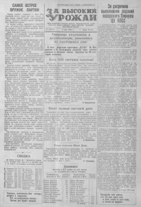 САМОЕ ОСТРОЕ ОР УЖ И Е ПАРТИИ Страна широко отметила 5 м ая— День Советской печати . Сорок тр и года н азад , 5 мая, вышел первый номер большевистской га зе ты «Правда»— боевого органа Центрального Комитета партии. От первого номера, вышедшего 5 мая 1912 го д а , до наших дней «Правда» верно с л у ж и ла, с л у ж и т и будет с л у ж и т ь кровным и н т е ресам партии и народа. Сила советской печ ати— в ее глубокой пар тийности, в ее верности всепобеждающему учению марксизма-ленинизма, в нерушимой связи с массами. Коммунистическая п ар тия неуста нно забот и т с я об укреплении и росте советской пе ч а т и . Перед работниками прессы сто я т п о четные задачи: активно содействовать при- творению в ж и з н ь у ка зан ий партии по крутому подъему сельского х о зяйс тва , по увеличению товаров народного потребления. В настоящее время вся деятельность г а зет с особой силой и последовательностью должна направляться на развертывание социалистического соревнования за притворение е ж и з н ь постановления январского Пленума ЦК КПСС. Большую помощь призваны оказать пар тийным организациям в деле мобилизации тр удящ их ся на решение задач стоящих перед районом, к а к районная газе та , т а к п стенные газеты и «боевые ли с т ки » , вы хо дя щие десятками в колхозах , МТС, совхозах, предпр ия ти ях и учр ежде ни ях . Можно привести немало примеров, ко гда стенные газеты неплохо выполняют свою роль. Заслуженной популярностью среди механизаторов, колхозников и с л у ж а щ и х польз ую т ся стенные газе ты Романовской МТС, колхоза имении Кирова, райфпнотдела и многие другие. Они живо и оперативно откли каю тся " на все события в жизни колл ек тивов, помогают партийным организациям в борьбе с недостатками. Надо постоянно помнить, что чем больше у га зе ты будет рабочих и сельских корреспондентов, тем на с т р а н и ц а х газеты будет освещаться полнее ж и з н ь района, колхо за, МТС, совхоза, предприятия . Редакция районной г а з е ты по сравнению с прошлым годом у лу чш ил а связь с массами. Если в 1953 го д у в редакцию поступило 350 писем, то уже в 1951 г о д у — 4 8 0 .Однако это еще не характеризует то го , что редакция до конца выполняет свои задачи. Проходившее совещание рабселькоров показало, что в работе редакции имеется еще много недоста т ков . На страницах г а з е т ы слабо освещается опыт передовиков сельского хозяйства, мало в газете выступает рядовых т р у ж е н и ков. Эти недостатка при сущи и большинству н аш и х стенных газе т . Быстрейшее исп р ав ление их , повышение роли газе т в х о з я й с т венной и политической ж и з н и во многом зави ся т от руководства печатью со стороны п артийных органи заций. Долг партийных о рга ни заци й направлять г а з е т ы на решение тех задач, которые стоят перед районом, колхозом, МТС, совхозом, предприятием. П р о л ет ар ии вс ех стран, соединяйтесь! 'I ж высокий " У Р О Ж А И Орган Мошковского ра йонного ком итета К ом м у н и с т и ч е с к о й парт ии Сове тского Союза и ра йонного Совета д е п у т а т о в т р у д я щ и х с я Новосибирской обл асти 37 (2066) 8 мая 1955 г . , Цена 10 коп. Товарищи к о л х о з н и к и и м е ха н и зат оры, равняйтесь по передовикам сева! 8 одая водители тр а к то р о в „ Д Т - 5 4 “ Ш. Мамонтов и Н. Безбородов с ц е п ам и т р е х с еялок з а с е я л и в колхозе имени Хрущ ева по 6 0 г е к таров пшеницы. Есть 4 0 0 гек таров пшеницы! Н а полях с е л ь х о з а р т е л и | щики Д м и тр и й 