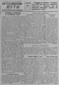 Пролетарии всех стран, соединяйтесь! 1оварищи колхозники и механизаторы МТС! Все силы на завершение подготовки к весеннему севу, на образцовое проведение зимовки общественного скота! и районного Совета депутатов трудящихся Новосибирской области ПО СТАЛИНСКОМУ ПУТИ Орган Северного. РК Коммунистической партии Советского Союза ВОСКРЕСЕНЬЕ 1 ФЕВРАЛЯ 1953 г. № 10 (1515) Цена 10 коп. УСИЛЕННО ГОТОВИТЬСЯ К ВЕСЕННЕМУ СЕВУ В директивах по пятому пятилетнему плану развития СССР XIX съезд указал: «Главной задачей в области сельского хозяйства и впредь остается повышение урожайности всех сельскохозяйственных культур, дальнейшее увеличение общественного поголовья скота при одновременном значительном росте его продуктивности, увеличение валовой п товарной продукции земледелия и животноводства путем дальнейшего укрепления и развития общественного хозяйства колхозов, улучшения работы совхозов и МТС на основе внедрения передовой техники и агрокультуры в сельском хозяйстве». Поставленная задача многому обязывает всех тружеников колхозной деревни,механизаторов, руководителей МТС и сельхозартелей. Как можно больше надо уделять внимания зимовке скота н всесторонней подготовке к весеннему севу. В передовых артелях района так и поступают. Полным ходом ведут подготовку к весенним полевым работам. В ряде артелей: им. Жданова, «Путь к социализму», им. Маленкова н других полностью засыпали семенной фонд п сейчас все семена довели до посевных кондиций. Прекрасную всхожесть при проверке лабораторным путём дали овес и пшеница в артели «Путь к социализму». Хорошо в этих колхозах н в колхозах «Путь Сталина» , им. 7-го съезда Советов, «Украинец» идет ремонт сельскохозяйственного инвентаря. Здесь отремонтировано более 50 процентов плугов, борон п другого инвентаря. Колхозы им. Крупской, им. 7-го съезда Советов вместе с тем выполняют и планы зимних агромероприятий. На поля вывозится навоз. Но забота о судьбе будущего урожая проявляется не везде. Ряд руководителей колхозов беспечно,бесхозяйственно относятся к этому важнейшему ' делу. До сих пор не приступили к ремонту инвентаря колхозы «Новый путь», «Вторая пятилетка», им. Калинина. Колхозы «Память Кирова», «Борьба за мир», им. Сталина, им. Максима Горького., «Общий труд» плохо готовят семенной материал. Ни одной партии семян не доведено до посевных кондиций. Не используются зерноочнстительные машпны. Не проявляет заботы о сортировке зерна Северная МТС. Два с половиной месяца без действия стоит машина «ВИМ», её не могут перевезти из одного колхоза в другой. Артели «Путь к коммунизму» н им. Калинина имеют некоторое-количество семян не кондиционных по всхожести, но к обмену до сих пор не приступили, хотя план обмена доведен еще в декабре. Ни в одном колхозе не готовятся к протравливанию семян. Не везде проявлена забота о сборе и вывозке на поля местных удобрений, а для некоторых участков особенно удобрения необходимы. Подготовке тягловой силы к весне также мало уделяется внимания. Все эти факты говорят о том, что вопросом подготовки к весеннему севу должны всерьёз заняться первичные партийные и комсомольские организации, правления колхозов, районный отдел сельского хозяйства. Шире развернуть социалистическое соревнование среди тружеников колхозов, добиваться выполнения заданий на подготовке семян,- и