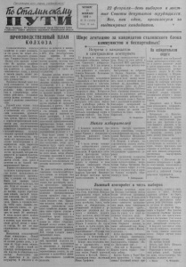 Пролетарии всех стран, соединяйтесь! ШСшПшин&1ш П У Т И Орган Северного РК Коммунистической партии Советского Союза и районного Совета депутатов трудпщихся Новосибирской области ПРОИЗВОДСТВЕННЫЙ ПЛАН КОЛХОЗА ЧЕТВЕРГ 19 ФЕВРАЛЯ 1953 г. № 15 (1520) Цена 10 коп. 22 февраля—день выборов в местные Советы депутатов трудящихся. Все, как один, проголосуем за выдвинутых кандидатов. Шире агитацию за кандидатов сталинского блока коммунистов и беспартийных! * В с т р е ч а с к а н д и д а т о м в ц е н т р а л ь н о м а г и т п у н к т е 15 февраля в центральном а н т г о е и г л о т и пу о н к С к р о т в у е е га тс с к о о б № г р о ал 1 ис д и ь л з я би и в р з с а б т т и р е е р л ч а ь и с т о аты сво р и а м йо к н а н н о д г и о дато и м с в ельс д к е о п г у о С ч о е в Т м ет о П о в в р . уд Н К н р и и е к к д о о о л в в а ы и е ч м м. п В о а з с н и а л к ь о е м в и и л а с л о од б о р г а о вш к и ан х д ся ида с та би в огра д ф еп и у е т й ат м ы о. л Д и руж вс н т ы ре м ч и ен а ы пл п о о д с и л с е м д е н н и т е ами сл б о ы в а доверенного лица. Избиратели гордятся своим кандидатом в д д з о а е й с п л у у т Н ж а и т и к ы т о . ь ла Е й с щ еб е В е ас с и с л л о а ь в в е с у в е и м ч п с е у м р м е о д е л л о о вого комбайнера района. Из г р ч о а и д б т а о е т л в к ь у н г о од с п в е о о р н е е й кр ув ы м е а в л ш а и я и чи н н в ы о а , р е м т ы з в н ы и а экономя горючее. ников в этом году То ов в л . ад П ев р а у е д т т н р е е ц т а ь . ей Нач сп ал еци он аль с н во о ю сть р ю а — бот к у узв Тартасской МТС трактористом, а бай п В н о ы е с р л с о е т д м у н п . и а е вш г и од е ы н р а абот с а о л бр к а о н м и и тт. Окунев, Теменева, Загре- б р д а а а л т в о у ш в , и н х н а с к я д аз р д у а г в л и и е о , сно с о в в т о н е о м м л у и н ц к а а а п н р с д а о в и б ленный в у е с р т т р ы ой в с а т н в и у е на рай р д а ц б а е о л н т ь т н р е а й . п ш О о с е о е б 4б е л н а н р г о а о з - б д ы ид л а о та обр н а а щ у ен л и уч е ш в е н н и и м е ание ра к б а о н ты электростанции райкомхоза. к б о л в а В го с д о а р т р а в и д е л т о н ст о н м ым и сл з в о б о в и л е р н а е т т н е . л и П е е й м руд п н о и за р о и к е азан о н б ы е й ща е л му не чест ж ь ал и ея дов с е и л т б р и у р д ат и е т л ь е с й я . на благо своих изК. Андреева. Наказ избирателей ш ре л в а н С и в б с Ч о т у л р в ь е а ш ч ш а и и м и с з п б . о и к д р а ъ а н ё т д м е и л о д е м а й том п д р е в о депутаты районного Совета Леонтием Ивановичем в н ы ие м В . 8 из ч б а и с р о а в тел в ь е н ч о е г р о а у п И ч о а в м с а е т н щ к о а было переполнено, а люди всёер н м п а и о и ю д н к х и т о с . р д я а и с Д л с о и к п в . а р е з р е В а е с л н т п а н р р о б е е е и л з о и ы л г д и р е и ц а у ф о м и т к ю . и о л з к С б х а а о и н л з - дидата и призвал в день выборов единодушно отдать свои голоса за т. Иванова. Престарелый б в и пч рат П е е л т ь ро Г в риг в о ы ри ст й у 7 п 8 а -л я Н е и т к н а п и н р й о о р с и и о з - л своего кандидата в депутаты помочь быстрее приобрести колхозу локомобиль, ускорить э х л о е з к н т и р к иф М и и к т а р ц о и ф ю ан кол М х и о х з а а й . ло К в о и л ч Ильин поддержал выступление Г.Н. Петрова и добавил, что у д к им ру о пне р н а н с о ш м и у ри к ть олхоз у у час н т е к о о б в х у о ю больницу, улучшить торговое р о е б в с О н л и б уж . ив ув ан ел и и е че т н р и у и жени к к о о л в ич . ес д т е в а л б к о о о т д е н к ая ик в из б Т б о а и л м р ь а н а р т и а е ц л е Ч ь и н г с и о т ц в я о а к , р о и в л а м а . ед О м р н а о а также подняла вопрос и о том, ч н ст т е в о е б н ы Ч н у у в 