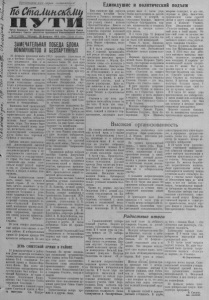 ► Пролетарии всех стран, соединяйтесь! 1шСтаЛшиКбМи П У Т И Орган Северного РК Коммунистической партии Советского Союза и районного Совета депутатов трудящихся Новосибирской области М£1ё ёР£»_26 февраля 1953 года | Цена 10 коп. ЗАМЕЧАЕТЛЬНАЯ ПОБЕДА БЛОКА КОММУНИСТОВ И БЕСПАРТИЙНЫХ 22 февраля проходили выборы в местные Советы депутатов трудящихся. Как и во всех прошлых избирательных кампаниях, в эти выборы коммунисты п беспартийные выступали в едином нерушимом блоке, союзе. По всем избирательным округам голосование началось точно в установленное время— в 6 часов утра. Люди непрерывным потоком шли на избирательные участки н подавали свои голоса за кандидатов сталинского блока коммунистов п беспартийных. Выполнив свой гражданский долг, трудящиеся хорошо проводили остальное время этого торжественного дня. В комнатах отдыха, клубах, пзбах-чп- тальнях были организованы танцы, игры. Там можно было прочитать свежий номер газеты', посмотреть кино, концерт художественной самодеятельности. Бойко шла торговля в буфетах ц магазинах. Выборы явились замечательной демонстрацией высокой сознательности советских граждан,демонстрацией силы н несокрушимости советского общественного п государственного строя. Это было желание и стремление еще теснее сплотиться вокруг родной партии и под ее руководством птти вперёд н вперед, к победе коммунизма. Такая политическая активность может быть только в нашей стране. II не может быть ничего подобного в капиталистических странах, где процветает бесправие и угнетение трудящихся масс. Только в стране социализма, народ, согретый солнцем великого закона—Сталинской Конституцией, показывает пример политической активности, единодушия, патриотизма, преданности своему родному правительству н партии Ленина- Сталина. Об этом говорят замечательные цифры голосования в нашем районе. К избирательным урнам 22 февраля пришло 100 процентов избирателей. Из них 99,8 процента голосовало за выдвинутых кандидатов Сталинского блока. Об этом ярко свидетельствуют- н простые, идущие от сердца слова, сказанные избирателями при опускании бюллетеней. Лучший чабан колхоза «Красный Октябрь» Зоя Михайловна Ликаровская, опуская бюллетени сказала: «Спасибо дорогому товарищу Сталину за счастливую жизнь. Я простая крестьянка получила большие нрава.С гордостью и удовлетворением отдаю свой голос за лучших людей». Престарелые колхозники Василий Анисимович Довгулев, Павел Егорович Трибуналов сказали: «Голосуем за нашего первого кандидата, друга колхозного крестьянства товарища Сталина, за ещё более светлое будущее— за коммунизм». С чувством высокой гордости за свою Родину подходили к урне молодые избиратели. Они голосовали за свою счастливую жизнь, за прочный мир на всей земле. Читаем мы и на бюллетенях патриотические надписи. Трудящиеся района избрали местные Советы. Депутатами вошли в них лучшие, достойные люди, честные труженики колхозных нолей и животноводства, прекрасные производственники п механизаторы МТС, представители нашей советской интеллигенции. Депутатами местных Советов являются лучшая колхозница артели «Путь к коммунизму» 3. Н. Блинова, лучший конюх колхоза им. Ворошилова Н. II. Волков, лучшие комбайнер и трактористка Тартасской МТС Н. В. Прудников и 0. А. Позднякова, учительница 3. И. Груенко, председатель колхоза