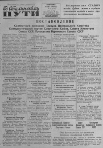 Пролетарии''всех стран, соединяйтесь! Ш СшЛин сксМц П У Т И ВОСКРЕСЕНЬЕ 8 марта 1953 года № 21 (1526) Цена 10 коп. Орган Северного РК Коммунистической партии Советского Союза и районного Совета депутатов трудящихся Новосибирской области Бессмертное имя СТАЛИНА всегда будет жить в сердцах советского народа и всего прогрессивного человечества. ПОСТАНОВЛЕНИЕ Совместного заседания Пленума Центрального Комитета Коммунистической партии Советского Союза, Совета Министров Союза ССР , Президиума Верховного Совета СССР М че и с н к Ц и о е с й н т т р р п о а в а л р ь т н и ы С и о й ю С з о К а в о е м тс и к т о С е г т С о Р С , К ою ом з П а м р , у е н з С и и о д с в и т ет и ум Верховного Совета СССР в это трудное для нашей партии и страны время считают важнейшей задачей партии и правительства—обеспечение б ст ес в п а ер в е с б е о й йн ж о и г з о нь и ю пра с в т и р л а ь н н ы о , го чт р о ук в ов с о в д о ю о ст ч и ере р д у ь ко т в р о е д б с у т е в т а, ве н л е и д ч о а п й у шщ е е й ния спло к ч а е к н о н г о о - либо разброда и паники, с тем, что- ^ б ч ы ить та у к с и п м еш о н б о р е азом про б в е е з д у е с н л и о е вно в об ж ес и п з е н ь \ выработанной нашей партией и прави- { тельством политики как во внутренних > делах нашей страны, так и в между- народных делах. Исходя из этого и в целях недо- > лущения каких-либо перебоев по руко- I водству деятельностью государствен- ) пых и партийных органов, Централь- } ный Комитет Коммунистической пар- 1 тип Советского Союза, Совет Мпнп- ^ стров Союза ССР и Президиум Верхов- У ного Совета СССР признают необходп- „ мым осуществить ряд мероприятий по в о е р н г н ан ог и о зац р и ук и ово п д а с р т т в и а й , ного 1. и государст О председателе и первых заместителях Председателя Совета Министров Союза ССР 1. Назначить Председателем Совета Министров СССР т о в а р ища Маленкова Георгия Максимилиановича. ми 2. Пр Н е а д з с н е а д ч а и т т е ь ля перв С ы ов м е и та зам М е и с н т и и с т т е р л о я в СССР тт. Берия Лаврентия Павловича, Молотова Вячеслава Михайловича, Булганина Николая Александровича, Кагановича Лазаря Моисеевича. 11. О Президиуме Совета Министров СССР 1. Признать необходимым иметь в Совете Министров СССР вместо двух о д р и г у а м н а о , в— од П ин рез о и р д г и а у н м — а Пр п ези Б д ю иу р м о С П о р в е е з т и а Министров СССР. П ди р у е 2 д м . с а ед У С а с о т т в е а е л н т ь а ов М С и о и т в н ь е , и т с а ч т т р о о М в и в н С и с С о с С т с Р т р а о в в вход П С я р С т е — С з Р и и первые заместители Председателя Совета Министров СССР. I I I . О председателе Президиума Верховного Совета СССР диу Р м е а ко В м е е р н х д о о в в н а о т г ь о Пр С е о д в с е е т д а ател С ем ССР През т и ов . Ворошилова Климента Ефремовича, освободив от этих обязанностей тов. Шверника Николая Михайловича. * * О секретаре Президиума Верховного Совета СССР 1. Назначить Секретарем Президиума Верховного Совета СССР тов. Пегова Николая Михайловича, освободив его от обязанностей секретаря ЦК КПСС. ма 2, Ве Н р ы х н о е в ш но н г е о го Се С к о р в е е т т а а ря С П С р С е Р зиди т у о в. ч Г у и о м т р а ь ки з В н а е а м р е х с о А т в л и н е т к о е с г л а о е н м д С р о а ве С т Ф е а к ё р д е о С т р а С о р С в я и Р ч . а Пр н е а з з и н д а и IV. О Министерстве внутренних дел СССР М в ст е и е н р н О н с и о б т й ъ с в т е о е д б р и е с н в з т о и н в п т у о ь а т — с р н М е о М н с и н и т н и и н и и х с с т т е С д е р р С е с л с т С т в Р в 