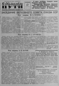 Пролетарии всех стран, соединяйтесь! fié CinûMihctckUij П У Т И Орган Северного РК Коммунистической партии Советского Союза и районного Совета депутатов трудящихся Новосибирской области 15 марта еостоялась Четвертая сессия Верховного Совета СССР. Председателем Президиума Верховного Совета СССР избран товарищ К. Е. Ворошилов. Председателем Совета Министров Союза ССР назначен товарищ Г. М. Маленков. ВОСКРЕСЕНЬЕ 22 МАРТА 1953 г. № 25-26 (1530-31) Цена 20 коп. ЗАСЕДАНИЕ ВЕРХОВНОГО СОВЕТА СОЮЗА ССР Товарищи депутаты! Четвертую сессию Верховного л л С я и о ю с в Т т е о и т в а о ч а т е р С к с и р к о щ ы ю и и х т з о а й Р д . е С е с п о п у в у т е б а т т л с ы и к к и ! х С о о б ц ъ и я а в С глубокой болыо в своем м се о р й дце п , от с ер ч и увст с в о о в м етс н к е и в й озвр н а а т р и о д проводил в последний путь с в т в е е о т л е а я г , о С д л С е ю п С у б Р т и , а м т о а г П о р В е в е д о р с ж е х д д о я а в т н е и о л г я о уч С С и о о вета Министров Союза ССР, С те е т к а ре К та о р м я мун Ц и е с н т т и р ч а е л с ь к н о о й го па К р о т м и и и с С а о р в и е о т н ск о о в г и о ча Союза Иосифа Вис Сталина. сари С о в н е о т в л и у ч ю а, намять Иосифа ВисСталина прошу почТоварпщи депутаты! От имени Совместного заседания т П а лен К у о м м а м Ц ун ен и т ст р и ал ч ь ес н к о о г й о Ко п м ар и т т и е и у н С м и ов с а т е р т В о с е к в р о х г С о о о в ю н С о з о г а ю о з С а С С , о Р в , е С т о а в П е р т е а С з С и М С д и Р и , а также от имени депутатов ю Ве з р а хо и вн С о о г в о ет С а ов Н ет а а ц —ио С н о а в л е ь т н а ост С е о й —Москвы, Ленинграда, Украп. ны вношу следуют« м ю ж е е з с н а т и н и е ого С н ов а з е а т с а е р д а а Н с н а с и ц м я и о о тр н С е а о н л в и ь е н е т п о а р с е т д С с е л о о й о в Речь товарища М. А. ЯСНОВА тить вставанием. (Все встают). Прошу садиться. Товарищи депутаты! 14 марта в Праге скончался м с П п к е у р о н б е г т л з о и и д к С е и н о , т ю в з е а Ч р , е н х ы н о й а сл ш о д в д р а о у ц р г к о о го й й С .Р о К в е л е с е т Готвальд. д л ю а у т м ю и у в т Ч с р е е а х т о у сло г в л а у к б и о и ко Вм п эт е е с у р т е е ж тя и с ж ва е н аротрудящиеся нашей страны. Прошу почтить память Клемента Готвальда ванием. вста (Все встают). Прощу садиться. Товарищи депутаты! Предлагается принять д хо у в ю н щ о и го й С т о е в к е с т т а О С бр С а С щ Р ен с ия в В ы е с р р л а е жением соболезнования Национальному Собранию вацкой Республики в с Ч в е я х з о и сл с о о смертью Президента Клемента Готвальда: „Национальному Собранию Чехословацкой Республики Дорогие товарищи! в п е у т б с В л к е и и р к х хо в в С ы н о ы р ц а й и ж а а л С е и о т с в т е и т г ч л е у с С б к о о и ю к х о з е а Ре с С с о о болезнование Национальному Собранию' Чехословацкой публики в связи с конч Р ин е о с й с п П т у р в б е е л з н и и н д к о е и г н , о та в д ы е Ч д я е а т х ю е о л с щ я л е о г и в о а с ц я л к ю г о о й б с и у м Р д о а е г р с о вождя народов Чехословакии товарища Клемента Готвальда. Вместе с вами мы глубоко Iскорбим но поводу кончины вождя- народов Чехословакии, неутомимого вого Чехослова о ц р к г о а г н о изат н о а р р а од н н о о- демократического государства, верного друга Советского Союза товарища Клемента Готвальда. Верховный Совет Союза ССР“ . тат Р ы а , зр с е ч ш и и та т т е ь , т п о р в и ар н и я щ ты и м ' д э е т п о у т текст обращения? Обращение принимается. д с г м о ' у ю о Т т С щ о р о в и е в а н е е р и т и е а в щ о и I п С V р С о д С с с е Р ы е п с : у с т и а в и т н ы ос