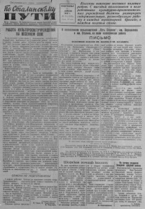 Пролетарии всех cmран , соединяйтесь! ! Ш>Сталин ckSUuj ПУТ И Орган Северного РК Коммунистической партии Советского Союза и районного Совета депутатов трудящихся Новосибирской области ВОСКРЕСЕНЬЕ 12 АПРЕЛЯ 1953 г. № 31 ( 153(5) Цена 10 коп. Колхозы накануне весенних полевых работ. С выездом колхозников в поле работники культурно-просветитель« ных учреждений должны развернуть содержательную, разнообразную работу в каждой тракторной бригаде, в каждом полевом стане. РАБОТА НУЛЫПРОСВЕТУНРЕЖДЕИИИ НА ВЕСЕННЕМ СЕВЕ _Весна вступает в своп права, Каждый день приближает нас к началу полевых работ. В МТС идут последние приготовления к выезду тракторных бригад в колхозы. Колхозные кузнецы заканчивают ремонт плугов и других сельскохозяйственных орудий. Ещё неделя, другая попустеют центральные усадьбы колхозов и МТС. Труд хлеборобов и механизаторов сосредоточится в основном на полевых станах, в тракторных бригадах. Первостепеннымделом теперь является забота о создании культурных условий для отдыха труженикам, которые будут работать в поле. От проведения весенних нолевых работ, от качества сева будет зависеть судьба урожая.. Если хлеборобам будут созданы надлежащие культурно - бытовые условия, то и работа их будет высокопроизводительной, не будут нарушаться сроки сева. В районе развернулась работа шефских коллективов по организации помощи колхозам в оборудовании тракторных вагончиков, полевых станов и создания в каждом колхозе детских ясель, чтобы женщина- мать, работая на полях, была спокойна за своих детей. Почётен и ответственен долг работников культпросветучреж- дений во, время полевых работ. Дом культуры, сельские клубы и избы-читальни обязаны широко развернуть агитмассовую работу среди тружеников полей, разъясняя нм задачи, поставленные XIX съездом партии перед сельским хозяйством в новой сталинской пятилетке. Культурно- просветнтельные учрежденпя должны организовать пропаганду передовой мичуринской агробиологической науки н агротехники, пропагандировать передовые методы новаторов сельскохозяйственного произ- водства.1 вся этаработатребует серьезного отношения, тщательной подготовки для проведения её в полевых условиях. Партийные и советские организации обязаны руководить культурно - просветительными учреждениями и осуществлять контроль за выполнением указаний. Большинство культпросвет- учреждений района составили планы работ на период весеннего сева и разумно сочетали проведение политико-массовой п воспитательной работы с хорошим культурным отдыхом. Агнтхудожествепные бригады на полевых станах — это дорогие гости. После выступлений участников бригад работа идёт производительнее, отстающие, после здоровой товарищеской критики, повышают темны и качество и добиваются выполнения норм на своих рабочих местах. Одним из необходимых видов культурного обслуживания трудящихся является кино. Районному отделу кинофикации следует серьёзно подумать над планом и графиком обслуживания механизаторов и колхозников в иоле, не забывать самые отдалённые бригады колхозов и сделать выполнимыми намеченные мероприятия. Надо учесть справедливые замечания некоторых работниковсельских очагов культуры, которые выражают обиду на плохое кинообслуживание отдалённых посёлков п бригад. Немалую роль в выполнении плана полевых работ 