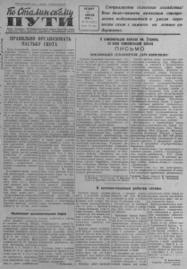 ч Пролетарии всех стран, соединяйтесь! Ш-СтйЛинсн&Ми П У Т И Орган Северного РК. Коммунистической партии Советского Союза и районного Совета депутатов трудящихся Новосибирской области ЧЕТВЕРГ 16 АПРЕЛЯ 1953 г. № 32 (1537) Цена 10 коп. Специалисты сельского хозяйства! Ваш долг—помочь колхозам своевременно подготовиться и умело перевести скот с зимнего на летнее содержание. ПРАВИЛЬНО ОРГАНИЗОВАТЬ ПАСТЬБУ СКОТА т т с и и т ю ю в С у р ю ж е е щ г и д о и в и о х т м н п е о р р в у о о о с д п п д у р с е к и т ш т в я и н а т в о и н м й о у , с т и и с п п р о о о а д д з с н в н о я и о б из первых мест занимает пра- 5 вольная организация летнего ^ содержания скота на пастби- ^ щах. Наступило время не только подумала* где и как н б ы уд й ет ск с о о т де с ржа п т е ь р с е я водо о м бщес е т г в о ен н а т з п о е о л в д ь П н н в р о о а ж к п н п т р ы о и о д й к ш г а л о о т о к м о т о в д и р г е т м о л ь , д ь ся у н н ы о п х к о и к э а к т з о о а т л м л щ х у а о а . , что где соблюдалась техника т п а а т с ы тьб н ы о , н т а а д м ою хо м р о о л ш о и ка е , р н е а з г у у л л ь у скота и откорму ш зо о н и л з е в т е н с е т г н о о, со чт де о р о ж с к а в о н и л и н о я е . й 70 Х в о пр р с о о е центов молока, л ц о е г н о то с в ко н т а а гу и ла 50 м — яс 2 7 а 5 0 —от 3 п 0 р в о зр ц п о е р н с о тов —от молодняка получаем мы от зеленых кормов. г т а и н е и В з м о а э в т т ы о о в т ч а н т о ж ь г е о м п а е с п с р о о и г в о о о д л е ов н ь а п я д о — о кр э ы т о о р также одна из важных задач по увеличению поголовья за с с т ч в е а т н с о т р а м д а а л . ьно П го оэт в о о м сп у рои в з о в п о р д о с организации содержания скота в пастбищный период должен находиться в центре внимания всех зоотехников, б н о ы т х аю р щ а и б х отни в ков жи п вот л н в ю о ет в д е о е р д й и с , н тв р а е р а . Никто другой, как они должны разобраться п осуществить весь комплекс агро-зоотехнн- п ч р ес и к я н ти х й, н вете н р а и п н р а а р в н л ы ен х ных мерок п в о о д д ъ В ст е в м о а у с . та и вш р е а е зв ся ити в ю ремя живо за т к н о ончить ветеринарную обработку скота, произвести мые прнвпвкп, к н а е с о т б р х а о ц д и и ю , отбор скота и т. д. димо осмотреть весь Н ск е о о т бхо и принять меры ции накожных если такие имею з т а к бо м л л е е с и в т к а о в н . и и д й а , В гуртах животных обязательно разбить по видам и группам. Для каждого гурта необходимо закрепить выпасные участки, разбив их на клетки, доста- [т с о т ч в н ен ы н е ые но но пло к щ а а ч д е и ств и у соо к т о в р е м т а . Подготовить водопой п загоны. Уже сейчас надо решить, где р и ов что дач ст н р о о г и о ть т и и з па. лет П н р и о х яв д и в т о ь заботу о жилье и культурно- б то ы р т ы о е вых бу у д с у л т овиях ухаж л и ю в д а е т й ь , ко з а скотом в поле. Правлениям колхозов надо д б у о д е р е й л у и о т п п ь ы ас т т о н у с ы о х х б о , о в е . л в Н ю н а и б з м я н щ а а н ч и и и х т е ь п с л о в ю д о е д д р е е н л д е о о в в . н ы о м П и у а ч с и м т т е у ь т х о ся да ,о м д в и о л л а ж в д е е н ва ух т о ь п д о е п в е с и ер е р м о а ш з ы в о и и т о и с с п и в о о л и ь ж т з ь и о в в о к а т н у н л и о ь я в т о у д р с к н т о ы в р е а м . о п в Х р ы и о х площадей и, если появится необходимость, о к а з а т ь первую помощь животному. Скот пастухам надо сдать по актам. Молодняк необходимо взвесить п потом производить взвешивание ежемесячно. бые Мол у о с д л н о я в к и у я над с о од с е о р з ж да а т н ь ия осои кормления. Каждый работник ферм, каждый пастух должны г в б о с о 
