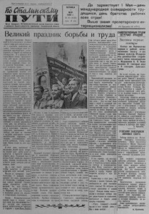 Пролетарии всех стран, соединяйтесь! ШСшМишОиш П У Т И Орган Северного РК Коммунистической партии Советского Союза и районного Совета депутатов трудящихся Новосибирской области Великий праздник борьбы и труда ПЯТНИЦА 1 МАЯ 1953 г. № 36 (1541) Цена 10 коп. Да здравствует 1 Мая— день международной солидарности трудящихся, день братства рабочих всех стран! Выше знамя пролетарсного интернационализма! з д м е и а м т й н П ! о с р В г . е о к э к т р ш р о а а а т с с р е н д а н ы ен р м ь а п и б р в о о а ч з з и в н д с й а н е м и х л е к ю н у д а г м в о П и ы л е к х р а о н в х а ор д у у а л р ш и н ц и о ы м ст , у ь ю де в м пр о б о н о л с р т е ь р т б а и е р р с у к з я а ую с с в в о о б ю о со д л у н и е и демократию. И в природе' всё г п н а е о р к м м а у е о т н д и н р с ю у о е л т т н р ц э у е т д , о а м : у л р а а с с т к п р о у а в д с о к и а ц ю и п о т р н с и я б н п а о о е ч т к ки аж зе е н л т а е с н я д ет е ь б р е е з в т д ь р о я н а х н в , ы а с . м . и . , нее нач н и е Рабочий класс нашей страны на протяжении многих лет утверждал право пролетариата о б т ы м х еч у ат с ь лов св и о я й х. пр О аз т дни м к але в нь л к ю их ш ва е л с о тв п и о й р , ой в н ко е тор б ы о х льше учас д т в в у о х десятков человек, презиравших нули н нагайки карателей, от тайных собраний и сходок,где выступали Ленин и Сталин, до д ги я г щ а и нт х с с к я и , х о д с е в м о о б н о с ж т д р е ац н и н й ых труот капиталистической кабалы и строящих- коммунизм. Кровью героических борцов из среды рабочего класса мы завоевали с п к р о а й во ж с и в з о н бо и д . ной Кр с о о в ц ь и ю али м ст н и о ч г е и х ш б п е и и с т с а т д л р н и а и з ш м п н а е ы о р х к в р о л а м ю ш а д й и е с й в к а в и ю л е т а с ф г я е л р и а е г в и к н . а а И мы знаем: как мы, мые славной ской партией, до К б о и м ли м с у р ь н у и к с о п т в р и о а ч д в е и а свободно п вольно' радоваться г к э о т т о о м пр у в ав д а к н л и ю а т с , е со т ,к а в т к ы о х е д щ об ё с ь л х ю и в т ш а с т е я к н а е х э г т о о , с капиталом завоевывает себе свободу, кто идет за смелым н и ис м т у и д ч р е ы ск м им а и ванг п а а р р д т о и м я —ми к , оммуза людьми, поставившими себе в д ц а и е м л т В и ь с ю я. э З т е д о м о т л б и ит с ь т с а я л , и ч т т е о , бы кто хо т зя р е у день миллионы и м м о илл п и о о д н аю ы т л д ю р д у е г й т д р р у у д г а у р н у е к з и рин клянутся в верности единому общему делу: Первомай был и всегда будет символом мирного труда, надежд человечества на л в у о ч е Д в ш а а у н , ю а у н д а о м л н ю и ас . , ко м т н о о р г а о я у п ж р е и з ч а и н, чтобы радостно и уверенно встречать этот светлый день! Могуче и прекрасно наше Отечество. С каждым годом крепнет его сила, умножаются его богатства, с каждым годом, как сказал великий Сталин, жизнь становится лучше п веселей. Он, наш учитель н в го ож П дь ер , во н м е ая д . ож Н и о л д до ело ны С н та е л ш и н н е а в надежных руках его верных и испытанных соратников. Знамя Коммунистической иартнп гордо и вольно реет над нами, над миллионами тех, кто сегодня еще придавлен ярмом капитализма,но мыслью и сердцем с нами.Идеи Ленина -—Сталина взчны ’и нетленны. Они живут в славных дела' с н к а о ш й е . й пар р т о и дн и о , й в К е о е м в м н у у н т и р с е т н и н ч е е й п р ш о и д в м н о в е й ш С н с С т е а С й л Р и , п н о с к л к о и о т т й о и р к ы д е е , ру в ж в бе н б е р н р а а у т с с с в т к к о в о и к а м м р уг и е н д а и С Ц р н о о е в е н д н е а т т и м р с и а к т л о е ь с с г н н о о в о г е о л с П п и л р к К и о а о