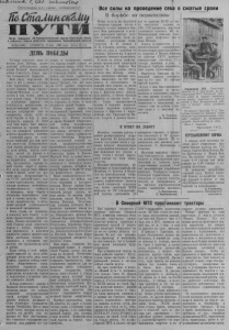 2 ПО СТАЛИНСКОМУ ПУТИ 9 мая 1953 года В райисполкоме и райкоме КПСС Рассмотрев итоги социалистического соревнования тракторных бригад п колхозов района на весеннем севе и по сохранению общественного животноводства по итогам на 5 мая, бюро райкома КПСС и исполком райсовета признали победителем в соревновании колхоз имени Крупской (председатель т. Блинов, секретарь партийной организации т.Крес- нов), выполнивший план весновспашки на 150 процентов, весеннего сева— на 17,8 процента с хорошим качеством работ. Колхоз имеет лучшие результаты по сохранению общественного животноводства н обеспечению хороших условий скоту при переходе па пастбище. Вручить переходящее Красное знамя райкома КПСС и райисполкома колхозу имени Крупской, отозвав его из колхоза имени Жданова. Отметить хорошую работу на весеннем севе н в сохранении общественного скота колхоза «Вторая пятилетка» (председатель т. О с и п о в), выполнившего план- весенней пахоты весновспашки на 145 процентов, весеннего сева на на 1 0,9 процента. Среди тракторных бригад победителем в социалистическом соревновании признана бригада № 3 Северной МТС, бригадир т. Стгрников, выработавшая на условный трактор 54,2 гектара при хорошем качестве выполненных работ. Вручить бригаде переходящее Красное знамя, отозвав его из тракторной бригады т. Лукбв- цова этой же МТС. Отметить хорошую работу тракторной бригады АЗ 7 Северной МТС, бригадир т. Кондратенко, выработавшей на условный трактор 47,5 га при хорошем качестве выполненных работ. Тракторной бригады ДМ 'Гартасской МТС, бригадир т. Краснов, выработавшей па 15-ти сильный трактор 46 гектаров с хорошим качеством. Райком и райисполком отмечают плохую работу на весеннем севе и по сохранению общественною поголовья скота партийных организаций и правлений колхозов: «Новая жизнь» (председатель т. Белов, секретарь партийной организации т. Серебрякова), «Путь Сталина» (председатель т. Фу- фачев, секретарь парторганизации т. Скороходов). Тракторных бригад тт. Литвинова и Тарасенко, из Северной МТС, и |тт. Комиссарова и Сергеева, из Тартасской МТС. Премии за развитие Самоотверженно трудятся на протяжении нескольких лет конюхи колхозов «Пшиять^Де,- щща»— Анна Григорьевна Дп- Денчук п нм. Молотова— Григорий Иванович Антппёнок. За истекший 1952 год от закрепленных за ними 21 кобылицы они получили и бохрШшлп ш) жеребят. В конце марта облисполком подвёл итоги соревнования по развитию коневодства в колхозах нашей области за 1952 год и присудил для района государВысокая производительность конюхам коневодства ственные денежные премии п 1000 рублей каждая и Почетные, граммоты т. ДпденчукА. Г. и т. Антппёнок Т Г Т Г Отвечая на присуждение премии, передовые коневоды дали нерушимое слово— ещё лучше работать и свой практический опыт передавать молодым работникам, чтобы к концу пятой пятилетки наш район занял первенство в областном соревновании по коневодству. А. Патрушев, зоотехник по коню. 1 Совети агронома Шире применять перекрестный и узкорядный сев Равномерная заделка семян в почву на требуемую глубину и равномерное распределение их на площади ноля является решающим условием для хорошего роста и развития растений. Существующие рядовые сеялки сравнительно хорошо заделывают семена зерновых колосовых культур на одинаковую глубину, но размещают их но поверхности поля неуд