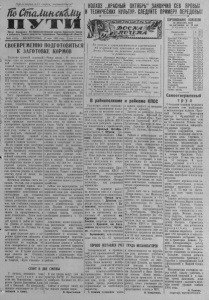 Пролетарии всех стран, соединяйтесь! ЙЬСтаМтск&Ми П У Т И Орган Северного РК Коммунистической партии Советского Союза и районного Совета депутатов трудящихся Новосибирской области №40 (1545) ! ВОСКРЕСЕНЬЕ, 17 мая 1953 года |Цена 10 коп. СВОЕВРЕМЕННО ПОДГОТОВИТЬСЯ К ЗАГОТОВКЕ КОРМОВ Создание прочной кормовой * б в а и з й ы—од у н сп о еш из но о го снов р н а ы зр х еш ус е л н о и я г в г л о о л т ав н о н о в о в ь й о я дс з с т а к в д о а а т — ч а и у п в в р е и л р и а о ч з д е в н и н и т о и я в и ерм ж п ен и о- . ном значительном росте его ' продуктивности. Директивами X ре IX но съ у е в з е д л а ич п и а т р ь тии пр п ои ре з д во ус д м ст о в т о сена на 80—90 процентов, клубнекорнеплодов—в 3—4 ра- ' за, силоса в 2 раза. Рост производства кормво ^ требеут от руководителей кол- * — р х н а о о б з м о о т о в н в , и , к д о и в з р о е о к в т е о т р с о ж п в е и ц в и о М а т л н Т и о С с в т , о о д а в с г т р в о а и с се у рь п е о зн са о д г к о и от ка н р ог т а о е ф н е п л я я к и во п п о р с о е - 5^, ву кормовых корнеплодов. Не- < обходимоподготовитьпочву 110 ^ всем правилам агротехники, I своевременно произвести посев } и щи з й ате у м ход о , бе ч с т п о е б ч ы ить в н т а е д к л у е щ ж е а м ) году получить обильный" уро- жай картофеля, овощей и 5 создать нужный запас сочных кормов в каждом колхозе. Не за горами пора заготовки * н б л с е ы и е й н л ш о н н с е ы е а й м , и к у о б а к м о к а р з п к а а и т н э ь и т с т и о я р , й а с в л о н е о с д е т т п у в о е о е я т д т . с г т с о Ч е в т т й е о о н в - час шире развернуть ремонт с п е о н р о т у н б ы о х рочн с ы ре х дс м т а в ш , и п н од и го т т р ов ан и с ть н си ы л е ос с н р ы ед е ст я в м а ы у , бо и р з к го и тов и ит н ь ач р а у т ч ь л о к ч е а ж и з И а с н т л с и к т а к у е , а кш ч л и т у а о г я к о т р в а з о м и т , м о о т о р г о д в и к е н а к . о в ч с п е к р к о , т о а ш п л в о а о м с х е о з з о ы не з х а о г р о о т ш ов о ки п к о о тр р у мо ди в лис к ь о —л своевременно подготовили всё необходимое для создания п т м р о о о в ви ч , л н т о и й ам до к с о с т т р о а м й о т л ч в о о н в ой о о е в б , с с а о я з д ы к е и , р х жа з к н а о г и р о е з ж н и о и л в а о и с т ь н в ы т х н е х ч п е р н о п и ш р е л о о д з у и к б м т л ы и а в г н о н о п е с о т л с ь у н , ч и а ж д д о а е й ж ни е а е р п т о е в л м ы и о си г и л л о ас р ь а . йо б Т н ы ак н т о е ь е т в п е о р к л п а о ж е л н быых, уб с ы е т й к ч и ас от не па о д т е с ж та а ва ж л и б в ы от в г заготовках молока. к з р а о о в п ш В у од и щ м и р е т н я е т н л д р о и е а м в к о о с л н т х с е о о о е з с м о т п в о о о я д к н л у а у и м з г и а а а , л л и и а с с ь р х у в о об н ч э и т и о с з м т о к в у а с л во и е и вр х к е . о м л К е х н о н з т н о а и к к и им ов н к е н о а лх о о р р з а г а с а м надо отнести им. Сталина, д «Н а о С вы ов й ет п ов у , ть « » П , ут и ь м. Ст 7 а -г л о ин с а ъ » ез и «Новая жизнь». В результате м б с п о е о у в з л з а н д а н е е б и н л о е и у т е н к о б п г о ы р о л л м а о н о о в а тн з з и о а а ш т г я е с о н н о то у р и т в я в о к а и н к о с с е э и н в т л а ы о . о В нынешнем году кое-где к т у оже к ещ п е ре н дс е то н я а щ ча е л й и к п а о м д п го ан т и ов и по уборке трави силосованию. Из 23 колхозов в одиннадцати производится ремонт машин, поделка ручного инвентаря и и подготовка транспорта. Из 190 сеноуборочных машин полностью отремонтированы т зо ол в ько не 39. в Н ыб и ра о л дин с и о з с к к о л л а х д о о в Сельхозснаба запасные части к машинам. Трава пошла в рост. На увлажненных почвах черездве—' т л р о и дую н