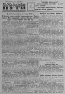 Пролетарии всех стран, соединяйтесь! тСшЛшмн&Щ П У Т И Орган Северного РК Коммунистической партии Советского Союза и районного Совета депутатов трудящихся Новосибирской области ЧЕТВЕРГ 11 ИЮНЯ 1953 г. № 47 (1552) Цена 10 коп. Товарищи колхозники! Организованно вступайте в заготовку кормов! Обеспечим общественному животноводству сытую зимовку. В райисполкоме и райкоме К П С С Об условиях социалистического соревновнаиясельских Советов, колхозов, МТС, полеводческихитракторных бригадна заготовке грубых и сочных кормов в сезон 1953 года го П хо ер з е я д йст р в аб а отн с и т к о а я м т и с б е о л л ь ь с ш к и о е задачи в области развития животноводства. В текущем т г о о г д о у с п к о о г т о а ло в вье кол к х р о у з п а н х ого до р л о ж г н а о возрасти на 17 процентов, овец ц н и — е з ы в н н х о т а д а с р . т 2 а в 0 з о м К п е о м р л а я п х х с т о а и з , ц ы ы у с в — а в е л л н а и , а ч з н а 8 т а м 3 ч о и л т о п е п к л р р а ь о о , масла, шерсти п других дуктов для удовлетворе п н р и о я растущих потребностей ления, дадут необход н и ас м е о е количество сырья для лёгкой промышленности. нен Г и л е авны го м су в дар б с о т р в ь е б н е но з г а о в п ы л п а о н л а л н р я ы а е з е С т в е с и й я т д ч и н а я и с с о з н б д а ж о а с р и н т ь в и у б о е п ы т и к н л о о з и р в а м о о д о в т ст о в с в й е о а т з б с д т а а в з н ы е я и н в . е п п н р е е ш й оч ш н н о е о й м й з в а ы к д о п а р о ч м л и н о р в ен о е й ш ии аю б э щ а т з е о ы е й . зн В в ач а у е ж с ние будет пметь дальнейшее развитие социалистического соревнования между сельскими Советами, МТС, колхозами, полеводческими и тракторными бригадами. Исполнительный к п о у м та и т т о е в т р т а р й у о д н я н щ ог и о хся Сове и та бю де р о райкома КПСС ЮТ 1 : . Учредить ПОС п Т е А ре Н х О о В дя Л щ Я е е Красное знамя райкома КПСС и райисполкома для сельского С че о с в к е о т й а, и кол т х р о а з к а т , ор М но Т й С, по б л р е и в г о а д д , ц за и в а о л е и в с а т в и ш че и с х ко п м ервен с с о т р в е о вно в вани со и на заготовке грубых и сочных кормов для общественного животноводства. щ КП ие 2 С . С К У р с и а т с а н н ы о р е в ай и и т з ь с н п , а ч о м т л о е к н о а м п а р е а р й е к б х о у о м д д у а я т п ск р и и м суж С д о а в т е ь т с а я м, п к ер о е л д х о о в з ы ам м , с М ел Т ь С , полеводческим и тракторным бригадам за достижение нап- в ч ы ес с т ш ве и н х ны к х ачест п в о е к н а н з ы а х тел и ей колина заготовке грубых и сочных кормов по итогам этих работ через каждые 10 дней. 3. Установить следующие п во ока с з е а л т ь е с л к и о , му кот С о о р в ы ет е у, да к ю о т лх п о р з а у , н М ой ТС б , ри п г о а л д е а в м одч н е а ско п й ерв и ен т с р т а в к о торв соревновании и на получение н п и ере р х а о й д к я о щ ма его КП К С р С асн и ого ра з й н с а п м о е л - кома: ПО КОЛХОЗАМ а) Заготовить в переводе на взрослую голову крупного рогатого скота не менее 40 центнеров сена и 50 центнеров силоса. На каждую свиноматку 40 центнеров корнеплодов п 12 центнеров зернофуража; б) ш бы и х е п а с г о р ч о н п т р ы е о х х в н е и с ч т к е и о с р к м и о з е в агот с в о р в о к л к у у и ч , грузакончить сенокос, включая стогование сена не более чем в бы 1 т 5 р — ав 2 , 0 д а ней за о к т ла н д а к ч у ала с к и о л с о ь с а закончить до 1 июля 1953 год в а ) ; обеспечить участие на с с е о н ва о н у и бо и ро к ч о н р ы мо х в р м аб а о к т си ах ма и ль с н и о л г о о к б хо о и л з т н и ь и ч ся е к с и т т , в о а г з о а , н ко я л т ч ы х т о о е з б н ы и