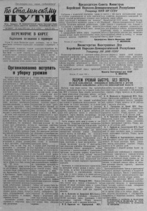 Пролетарии всех стран, соединяйтесь! Яб Сш иш и х&Щ П У Т И Орган Северного РК Коммунистической партии Советского Союза и районного Совета депутатов трудящихся Новосибирской области ЧЕТВЕР Г , 30 июля 1953 года № 61 (1566) цена 10 коп. ПЕРЕМИРИЕ В КОРЕЕ Подписание соглашения о перемирии Утром 27 июля Пекинское радио сообщило, что в Пань- мыньчжоне состоялось подписание соглашения о перемирия в р К о ор д С е н о е г о . л й а а ш рм ен и и и е п ки по та д й пи ск са и н х о н г а л ро ав д о н й ых де д л о ег бр а о ц в и о и льц К е о в рей г с ен ко е й рал Н о а м Н ри а с м П он о И д о р п м и о , м с г а л н — а и в е о с й о со д д н г е о л л а е й ш га е ц с н т и и о и я ро к н с о о ы м с , а т н о и д я о л в о а г с н е ь и н я е в рал О - 1 О л 0 е Н й , ч — т а е с н с о а в н д т р о у у м г т о р й а . Гар п о м са е н ст и н я ом с у огл к а о ш р е е н й и ск я ом о у гонь вр д ем ол е ж н е и н . Ч б е ы р т е ь з п 1 р 2 ек ч р а а с щ ов ён. после ТА п С од С п . иОрганизованно вступать в уборку урожая Председателю Совета Министров Корейской Народно-Демократической Республики Товарищу КИМ ИР СЕНУ л ч п о а а н р С г и о л о д е о у е б б , п щ о е к к р е о н о е е т и го е о в у р д о о ы р о о в й п р в л о а е д с т о с п в м п о п а с р е т а е р р п н е и п и м в п е и ае р в п т и о е и р у е в с м п с к е е и а м ш к ри н с я о о в е в е е л т в о и с ы к к к о з о у н в м ю а л п е о с б С т е н о д г ы у л х а г ш е к р е и о н т и и а ч е й е с с о к ко и г п х о ер н е к а м о р и р о р е д и й н и с ы к х о в го К д о о п р б а е р р е о о в д о а л я ь в и ц л е я в д е . о т б ся в то же время крупной победой всего лагеря мира п демократии. С прекращением войны перед корейским н на ар ль од н о ог м о вст е а д ю и т нст з в а а дачи ко в р о е с й ст ск ан ог о о влен г и о я суд н а а р ц с и т о в а Москва, 27 июля 1953 г. н п р о е г й в о с м к е о х м ст оз е у яй с н с а т т р в е а м о , д з р ув а а д о з а й р ч у н и ш ой е . н в н о о сс г т о ан н о а в в л я е з н а и н я ной нар к о о д Правительство СССР желает Правительству Корейской лики успехов На в ро р д а н з о р - е Д ш е е м н о и к и рат э и т ч и е х ской бол Р ь е ш с и п х уб и н за е т о ь тл в о с ж ю ны в х озм за о д ж а н ч ую п п в о ы м р о а щжа ь ет ис г с о т т р о а в д н а о в с ш ть ем о у к с а я корейскому народу в налаживании мирной жизни п залечиванпп тяжёлых ран, вызванных с к и р м ов о о ст п ь рол с и в т ое н й ой Р в од о и й н но ы й . за свободу п незави Председатель Совета Министров СССР Г. МАЛЕНКОВ. Министерство Иностранных Дел Корейской Народно-Демократической Республики Товарищу ЛИ ДОН ГЕНУ Подписание перемирия п окончание войны, н ш т а и о ч в й е я с з к ан п ой о н б о е й Р д е о с к й п о у р б е л й К и ск о к о р и м ей у и ск н с о а а й м р о о о д т у в , Н е а я р р в ж о л е д я н н е н о т ы - с Д я х ем б о о к л к р ь и а тайских народных добровольцев и, вместе с тем, крупнейшим успехом демократического лагеря мира. Героический корейский народ, принесший Москва, 27 июня 1953 г. большие жертвы к защпте м к ос р т е и ше и ни с ю во з б а о д д а ы ч , восс с т м а о н ж о е в т ле т н е и п я е с р в е ь о д е и й н п с р т и в н а с е т з с у а в п в о и и е т й с ь иРодины, к восстановлению пострадавших городов п сёл,к подъёму народного хозяйства страны. Во всём этом корейскому народу обеспечена активная йоддержка и помощь Советского Союза и других демократических стран. Министр Иностранных дел СССР В. МОЛОТОВ. жая Н . ас О т з у и п м и а л я а р п о о ж р ь а у со б з о р р е к в и ае у т ро и необходимо немедля ни одного