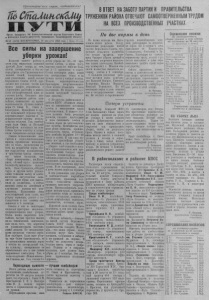 Пролетарии всех стран, соединяет есъ! Ш йпаЛшш%Лщ П У Т И Орган Северного РК Коммунистической партии Советского Союза и районного Совета депутатов трудящихся Новосибирской области № 69 (1574) ВОСКРЕСЕНЬЕ, 23 августа 1953 года | Цена 10 коп. Все силы на заверш ение уборки ур ож ая ! Колхозы нашего района в этом году вырастили хороший урожай. Деле теперь за тем, т н ч х е т ы о р о з е ь б н ы ы у р б х е р ш а с е т в н ь о п и е о в я е л р м г е е о и й м . Т , е р н у н ж о во е о н и д и у к ш б и е е з в к л о п е л о н пятой сессии В ла е г р а х ю ов т но в г с о е С у о си ве л т и а я, СС чт С о Р б , ы п к р а и к можно скорее справиться с у г н б о и о т т р о ь о в ч о г н к о ы су х м д л и а е р б с р а т а . в б е о н О т н а с м н ы и о й вн и п ое л в а ы н п в о з н л а и в б м о а а д й н и н и т о е е в л , у ь д н п е о о л в ст я ы и е ш т . е с Л я н у и ч ю ш ра и б е и о х т к е о п м р б о к а и о й з м неры тт. Смык В., Смык А., В ги и е ног п р о а к д а о з в ы , ваю П т рок об о р ф а ь з е ц в ы и тр д уд р а у , в з п о е е в р р а ш е н в е и ы н я п с о т т л в е н у х ю я н ю т и т к п и р з . и а е д Т м а а ы н к и , я и к п о сп м о б л а с ь й о неры Адам Смык и Василий П б н а и р й л о н к и ы оф -с т ь о р е в е в е т р ь ш ю е п н о о н с ч о т и а с в п т и о к л т у е и ри и на з у е с р к т н о р а м а . м ц б и а а и й ш У н и м о н н в е а , л и о т п е о р к и а и м з х с е е , п р н о н е д л о н в ь о и у з ч е х о и с в с м а т н м е и н и е т н е х е а а л я н ьн и к ы з р о а а х м н б о о е та со н д а ру п ж о е д с р т а в б о отк п е ол з е е в р од н ч а е , ск т и ес х ю и т тракт т о а р к н и ы м х бри к г о а л д хоз п а о м з , волякак н « и За н р а я , «Н к о о в м ы м й ун п и у з т м ь а » *, к н о м л .К хо а з л а и м Больше-Куликовского вета, Ново-Троицкого, « с О е б л щ ьс и о й з н н т н а р я и ы г у л е м о д и т и » п о о в з т и а к е с и м д . д а п п ч р а А о е у м л в г и и м г з у е м е р с ж с т н я а в о а ц т е в а в с с т о , у к и н о и е и а у в х с с ы и л е з п е л а й о б д е ч л о н а а с вывозка зерна на линейный и глубинные ливается. К п о у л н х к о т з ы ник в и сё э у т с и и х сельхозартелей дали слово, что у су б д о а р р к с у тво зе м рн н овы се х в , р о ас з ч и е м т ых с о г н о и закончат к 1 сентября. Вместе с тем в некоторых колхозах преступно медленно, неорганизованно идет уборка. п О ба з ч й - е з н н а ь ов, т н е ч х и а н з с и к т а ч ы е е ск в и п ы р х р о а с б т о н о т и е к п а о м л а а ш к д и о о м н к, или из-за того, что агрегаты не укомплектованы н ва ы н м ы и п л р ю о д ц ь е м сс и ы . Не очи м с е т х к а и п н о и з с з е т и р о р н я о а н . И ка ли ещ н е аоб б о о р л о е т е . б Е л с а л г и оп и о д л е у т чн у о б , ор то не организована вывозка зерна с точков на центральный ток, на сушилку, своевременно не обрабатывают его н тем самым сдерживают хлебосдачу. Так, в сельхозартелях «Новаяжизнь», нм.Сталина,им. 7-го съезда Советов убрано но 25—40 д ш ц а е е н р т ст о 2 в в — у х 5 с л д е а б п н о р о в о , ц н е е н а то м в з н е о р г н и к а м п б л г о п о а л н р с ь о у у . Сотни центнеров зерна лежит па центральных токах и на точках почти у каждой полосы. Только неразворотлпвостыо •бригадиров, стью можно об н ъ ео я р сн га и н т и ь зова т н а н к о о е положение. Не используются с н п ы ол е С но с й 2 р 0 ед а с н т в а в г г а у р . с у т з а кой райи т с р п а о н л с к п о о м рти н р и ай к ко н м о К з П ав С е С рше о н б и ъ ю явил к и осо д в е и к ц ад ы хлебов п выполнению плана х х л о е з б е оз д а о го лж то н в ы ок. б В ыт к ь ажд р о е м аль к н о ы ле расчеты, сколько необходимо в день скашивать хле