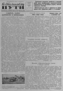 Пролетарии всех стран, соединяйтесь! ШСшЛшшСвМц П У Т И Орган Северного РК Коммунистической партии Советского Союза н районного Совета депутатов трудящихся Новосибирской области ЧЕТВЕРГ 1 ОКТЯБРЯ 1953 г № 90 (1585) Цена 10 коп. Труженики сельского хозяйства с каждым днём шире развёртывают социалистическое соревнование за достойную встречу великой годовщины Октября. Мобилизуем все силы и средства на завершение всех уборочных работ к 5 октября! УСКОРИТЬ УБОРКУ КАРТОФЕЛЯ И КОРНЕПЛОДОВ В этом году колхозы района посеяли на больших площадях картофель и корнеплоды, несколько колхозов занялись овощеводством п 11 о ч т п везде выращен богатый урожай овощей п картофеля. Задача теперь состоит в том, чтобы своевременно, без потерь убрать этот урожай. Нынешняя осень вполне благоприятствует ' уборке и долг правлений колхозов правильно организовать труд колхозников па уборке картофеля и овощей. Если сбор этих культур затянется до дождливых дней, то хранение картофеля значительно усложнится и может привести к порче его, как это имело место в колхозах в прошедшие годы. Вышедшее в свет постановление Совета Министров н ЦК КПСС «О мерах увеличения производства п заготовках картофеля и овощей в колхозах и совхозах в 1953— 1955 годах» призывает колхозников собрать полностью весь урожай, обеспечить полную потребность в семенах па будущий год, обеспечить животноводство, а остатки продать государству по новым, повышенным ценам. Главнее вин манне необходимо уделить сейчас уборке картофеля с семенных участков. В тех случаях, где семенной участок не отвечает требованиям посевных качеств, нужно •заменить его рядовым участком, с общих посевов, с выдающимися качествами клубней. В будущем году каждый колхоз обязан расширить посевные площади картофеля и корнеплодов, а для этого необходимо сейчас серьезно подумать о - создании семенных фондов. С уборкой урожая этих культур у нас не совсем благополучно. На 25 сентября, па поступившим от колхозов сведениям, было убрано картофеля всего до десятка гектаров. А 29 сентября закончили уборку только колхозы «Заря коммунизма», им. Калинина, «Путь Сталина» и другие. Артель «Украинец» убрала зерновые 25 дней назад, но до сих пор не убран картофель с 2 гектаров. Не выкопан картофель в колхозах им. Жданова и «Новая жизнь». Такое состояние вызывает беспокойство п обязывает колхозы, п всё население района, принять практические меры к ускорению уборки картофеля. Не в меньшей мере необходимо организовать в колхозах, где нынче шире развито овощеводство, усиленный сбор овощей. Нельзя допустить, чтобы выращенный урожай капусты, свеклы, турнепса п других овощей остался на огородах до заморозков, после чего качество этой продукции сильно снижается. Ошибки прошлых лет, когда урожай огородных культур недооценивался как следует и тысячи пудов турнепса, свеклы и других корнеплодов замораживались в буртах, а затем частично шли в корм, а частично гибли, не должны нынче повториться. Надо мобилизовать все резервы колхозов, организовать воскресники и с помощью общественности добиться уборки' овощей п картофеля в ближайшие 2—3 дня. Большую помощь оказывают колхозам учафиеся школ. Их участие значительно ускорит окончание всех сельскохозяйственных работ. Но собрать с поля это еще не значит, что все в порядке с уборкой корнеклубнеплодов. Бол