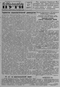 Пролетарии всех стран,соединяйтесь! Ш СшЛшим&Мц П У Т И Орган Северного РК Коммунистической партии Советского Союза и районного Совета депутатов трудящихся Новосибирской области СУББОТА 5 ДЕКАБРЯ 1953 г. № 9 Ц 1 6 0 2 ) Цена 10 коп. Под знаменем Советской Конституции наш народ, руководимый Коммунистической партией, уверенно идет вперед к новым победам в строительстве коммунизма. Торжество социалистической демократии Сегодня большой всенародный празднпк—День Конституции Союза ССР. 17 лет, прошедших после принятия новой Конституции, убедительно продемонстрировали перед всем миром великую силу идей социалистического демократпз• ма. Заботой о благе народа, о процветании нашей Родины проникнуто все содержание Советской Конституции— Основного Закона СССР. Наша Конституция является Конституцией победившего социализма и развернутой социалистической демократии. Она законодательно закрепила тот всемирно-исторический факт, что Советский Союз построил социализм и вступил в полосу постепенного перехода от социализма к коммунизму. В результате осуществления политики индустриализации страны и коллективизации сельского хозяйства создана новая, социалистическая экономика, не знающая кризисов и безработицы, дающая все возможности для зажиточной и культурной жизни народа. В соответствии с изменениями в области экономики изменилась и классовая структура советского общества. Окончательно были ликвидированы эксплуататорские классы, навсегда уничтожена эксплуатация человека человеком. В нашей стране остались два дружественных класса—рабочий класс и класс крестьян, являющиеся полными хозяевами страны и всех ее богатств. Совершенно новой стала и со ветская интеллигенция. В условиях социалистического строя союз рабочих и крестьян еще больше окреп, превратился в дружбу между ними,упрочилось морально-политическое единство советского общества. В Советской Конституции записаны великие принципы социализма. Политическую основу СССР составляют Советы депутатов трудящихся, выросшие и окрепшие в результате свержения власти помещиков и капиталистов и завоевания диктатуры пролетариата, Экономической основной является социалистическая система хозяйства и социалистическая собственность на орудия и средства производства. В стране осуществляется принцип социализма: «От каждого по способностям, каждому по труду». Наше государство создано в интересах народа и управляется самим народом—в этом ярко выражается подлинный демократизм социалистического строя. Гениальный Ленин, создавший Советское государство, указывал, что у нас есть чудесное средство удесятерить наш государственный аппарат, это средство— привлечение трудящихся к повседневной работе по управлению государством. Более полутора миллионов граждан избрано у нас депутатами Советов, десятки миллионов работают в постоянных комиссиях Советов, в профсоюзных, комсомольских, кооперативных п других общественных организациях. Другую картину мы наблюдаем в странах капитала. Буржуазия уже давно забыла о «естественных и неотчдшлемых правах и свободах человека», которые она афишировала раньше. Наступил кризис буржуазной демократии. Империалистическая буржуазия открыто переходит к методам фашистской террористической диктатуры. Она, как указывал И. В. Сталин, растоптала пр