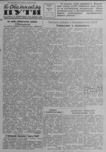 * Пролетарии всех стран, соединяйтесь! тСтаЛинаСсЛщ П У Т И Орган Северного РК Коммунистической партии Советского Союза и районного Совета депутатов трудящихся Новосибирской области Ко всем избирателям района Обращение УЧАСТНИКОВ РАЙОННОГО ПРЕДВЫБОРНОГО СОВЕЩАНИЯ Дорогие товарищи! н ш а и р м од е в д ы и д н в о и д г у а ш ет ием кан с д о и в д е а т т с а к м и и С й больв депутаты Верховного Совета СССР своих лучших сынов и дочерей, активных строителей коммунизма. На своих ниях, проводимых по сл со у б ч р аю а выдвижения и поддержания кандидатов в депутаты ховного Совета СССР, кол В хо ер з ' ники и колхозницы, рабочие МТС и интеллигенция района называют имена руководителей нашей партии н* Советского £ п к л р о о а т в в о а и в , т а е , Н л . ьст С К в . а . Хр тт у Е . щ . Г ев . а В М , о . р В о М . шМ а и л . л е М о н в о а , Л. М. Кагановича. ны также кандидату В р ыы став т л ов е , Яковлева И. Д. — секретаря Новосибирского Обкома КПСС по Татарскому избирательному округу № 249 по выборам в г т С с р о и о о у в б в г а у и ет р И № х с о к . з о С 2 я м А о 3 й у ю . с — з т п и а в з о М а б и и в н р ы и С и а б С т с о т т е С р о л р а в Р ь а м . н с п о Б в е о м е л н у ь С е Н о с д о к в о и к е в о к т о Национальностей. В эти знаменательные дни с м т н р а о у у н в ш н о н и и й о с м г т о а с и и я ч л а е о в с й а к к н р о г о й а в п р н р д а о п а я я а в р л т с я и в е и я т з с -- я ь ис К п о н ы м е советского н м м а у и р н , о и д н с а т е о п с в об ш е п д и и р б м о е о ч с с а п т й а ь ш рт и и м б й л и н о ы ка х м . а к с о с м а В нашей д р и о д д а н т ы о е в ма в ссы де с п т у в р т ы а а н д т в е ы игаю с в а ы т м с и ш ка е н г н о аоргана государственной власти. В ж ск у и а о й з т н л о и и й ч з и б и и « р д а о е т т м е о л л к ь и р н ц а ы е т м й и е и р » н , з о а й к с о о н б в у е н т р е знает никаких ограничений к т о руд за я с щ л и у х г с а я н в а их общ пр е а ст в в а е х н . н Т о о м ль и трудовом поприще является у нас мерплом при выставлении кандидата в депутаты. н п он р и и н т Т з о ь ы е о с в я в а а р п е в и р т е щ е д и д в и в ы н с и б е ы о з х б й р и н о р б В е а л т а о е с с к л о и ве ! к о щ б о а ъ м н Р е м и а д е у й и нистов и беспартийных и в в д е е т нь СС вы С б Р о —ро 1 в 4 в ма В рт е а рх 1 о 9 в 5 н 4 ый го С д о а , отдать своп голоса за наших кандидатов в депутаты с таком л ж о е Т п е о р д в и и а н р и о и д х щ у и ш в и ы е д м в , и и з ж к б е а и н к р и а и т . е эт л о и! быУ советского народа есть т р и о е дны в е традиции: каждое с б о л б а ы го жизни страны отмечать з н а е ци т о о н л н ь ы ко м иде е й д н и ы нс м твом и , ор н га о ни и у н с о п м еха с м т и рои в те н л а ь ш ст ем ве. хозя П й о ст эт в о е м н у мы призываем всех щихся района поддержать тр э у т дя и славные традиции и с полным напряжением сил добиться новых трудовых успехов. в п и р т е ь М тв ы о в р с е е п н р и у и е с з и ы л в в и а я ж ем и н зн а ь Ва у с р с е п ш е н е ш н а н п и о р й е а XIX съезда партии, ского Пленума ЦК с К ен П т С я С брь и последующих решений партии и правительства, направленных н н а ого дал хо ьн зя е й й с ш т е в е а ра н звит п и о е вы н ш ар е о н д и е уровня благосостояния масс. Мы призываем Вас настойчиво добиваться ликвидации с н в т о ы а д х т с к т о в у в а ч , . ас и т м к е а ю х щи н хс а я ше н г а о от п д н р е е о л д и ь о з д ч а а ч с Т и о п в о н а с о р т и а д щ в а л и л е ь н н ы е и й з ш б о и е г р м р а о у т м е н л п ы и о ! д е ъ С ем е з й у а сельского хозяйства нашего района. Конкретно эти задачи м 