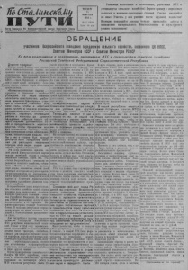 ПО СТАЛИНСКОМУ ПУТИ 25 февраля 3954 года 2 О Б Р А Щ Е Н И Е участников Всероссийского совещания передовиков сельского хозяйства, созванного ЦК КПСС, Советом Министров СССР и Советом Министров РСФСР Ко всем колхозникам и колхозницам, работникам МТС и специалистам сельского хозяйства Российской Советской Федеративной Социалистической Республики _ _ _ _ _ _ _ (Окончание) Товарищи колхозники и колхозницы , работники М Т С и спе циалисты се льско го хозяйства ! Берите пример с передовых кол хозов и машинно-тракторных с та н ций. Смелее внедряйте их опыт. У чи те с ь у них уменью вести крупное хозяйство ! Всемерно повышайте доходы , больше проявляйте заботы о повышении материального бла госостояния и куль турно го уровня колхозников ! Мы призываем работников науки более активно помогать сельскохозяйственному производству, В настоящее время многие наши ученые слабо связаны с колхозами, не всегда откликаются на их нужды н запросы. Между тем в тесной связи науки п практики заложен огромный источник подъема сельского хозяйства. Партия п правительство поставили перед колхозами и МТС задачу всемерно развивать зерновое хозяйство как основу всего сельскохозяйственного производства. Товарищи колхозники и кол хозницы , работники М Т С , спе циалисты сельско го хозяйства! Мы призываем вас добиться в 1954 голу перевыполнения плана по урожайности и валовому сбору зерновых, зернофуражных, бобовых, крупяных н других куль тур . В этих целях обеспечим весенний сев сортовыми семенами, проведем снегозадержание, больше вывезем на поля удобрений, хорошо отремонтируем тракторы и машины, подготовим инвентарь и живое тягло. Образцово организуем весенние полевые работы, уход за озимыми и яровыми хлебами. Расширим посевы кукурузы , внедрим квадратно-гнездовой способ её посева. Важнейшим резервом увеличения производства зерна, наряду с повышением урожайности, является освоение целинных и залежных земель. У ж е в этом год у колхозы и М ТС Сиби ри, У р а ла и Поволжья должны за с ч е т освоения целинных и за леж ны х земель значительно ра с ширить посевы зерновых к уль т у р и подготовить для посева под урожай 1935 года дополни тельно несколько миллионов гек таров. Мы твердо уверены в том, что сибиряки, уральцы и волжане, показавшие высокий трудовой героизм в создании мощной индустрии п развитии крупного социалистического сельского хозяйства, отличившиеся своим героизмом на фронтах и в тылу в годы Великой Отечественной войны, с честью справятся с боевым заданием партии и правительства по освоению целинных и залежных земель. Колхозники других районов страны окажут вам всемерную помощь в этом великом деле. Партия и правительство ук а зывают, что неотложной задачей в сельском хозяйстве является быстрейший подъем животновод ства Товарищи животноводы и работники МТС! Дадим стране больше молока, мяса, тонкой п полутонкой шерсти, яиц. Добьемся тою, чтобы животноводство в каждом колхозе стало высокотоварной п высокодоходной отраслью общественного хозяйства. Для выполнения этих задач мы обязаны успешно завершить зимовку скота, полностью сохранить взрослое поголовье п молодняк, хорошо организовать кормление и уход за скотом, создать прочную кормовую базу в каждом колхозе. Сделаем этот год годом высоких урожаев к у к у рузы, подсолнечника на силос, кормовых корнеплодов п о