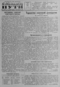 2 ПО СТАЛИНСКОМУ ПУТИ 18 марта 1954 года В ответ на призыв партии Работать в колхозе на любом участке Сентябрьский и последний Пленум ЦК КПСС поставили большие задачи перед сельским хозяйством, и Коммунистическая партия призывает всех колхозников, работников МТС, коммунистов, комсомольцев, всю молодежь смело решать поставленные задачи, вести сельское хозяйство к новому и к новому подъему. Горячо откликнулись на призыв родной партии комсомольцы страны. Едут они во все концы нашей необъятной Родины на освоение целинных земель. Многие коммунисты и комсомольцы нашего района изъявили желание и уже трудятся в колхозах и МТС. Я тоже не хочу стоять в стороне. Я комсомолка, и должна отозваться на призыв партии.Иду в колхоз „Заря коммунизма“. Буду честно трудиться на любом участке. Трудности меня не испугают. Если партия сказала „надо“, мы должны ответить „есть“. Призываю всех комсомольцев поддержать патриотическое движение, смело итти на любые участки колхозного производства. Это будет лучшим ответом на повседневную заботу партии и правительства о нас, советских людях. В. Смык, председатель Гражданцевского сельсовета. КомсомолЬцЫ! Следуйте примеру Комсомольцы села Верх- Красноярка Алексей Большаков и Григорий Питаев решили последовать патриотическому примеру многих комсомольцев района—пойти работать прицепщиками в тракторные бригады колхоза «Новый путь». Призывают комсомольцев организаций п учреждений района пойти в колхозы и МТС. Л. Парамонова, секретарь райкома ВЛКСМ. Растет комсомольская организация, улучшается её работа Еще недавно наша комсомольская организация была незначительной. По за истекшие месяцы этого года в организацию приняты !) лучших пионеров нашей школы. Готовятся к вступлению в ряды ВЛКСМ ещё несколько пионеров и учащихся. Намного улучшилась п работа у нас. В Предвыборные дни комсомольская и пионерская организации. ученический комитет школы веди большую работу за достойную встречу дня выборов в Верховный Совет СССР. Начали с того, что комсомольцы и активные пионеры стали посещать избирателей и разъ- ясиять им права и обязанности граждан СССР, записанные в Советской Конституции. Побеседовав, ребята напоминали колхозникам о дне выборов и призывали к дружному голосованию. Коллектив художествепиой самодеятельности школы приготовил концерт для избирателей и побывал в день выборов с показом самодеятельности в поселках колхоза. Н. Филиппчук, секретарь комсомольской организации Останинской школы. Письма в реданцию БЛАГОДАРНОСТЬ РОДИТЕЛЕЙ Коллектив работников детского сада села Северного окружил своих маленьких воспитанников материнской лаской, заботой, вниманием. Умело поставлена и слюбовью, с душой проводится там большая воспитательная работа с детьми. Хочется от всего сердца сказать воспитателям и обслуживающему персоналу детсада от имени родителей большое спасибо. В. Межуева. Г. Маевская. МолокоБольшинство жителей деревин Останкина досрочно рассчитались с государством по сдаче молока и многие сдают сейчас молоко в закуп. Так продают молоко в закуп Анастасия н Екатерина Кгржовы, -в закуп Федор Карписоиов, Александра Кононова, Владимир Путпнцев и другие. Сдавая молоко в закуп, дадим стране больше масла. Дребенцова, зав. сливкоотделением. Врач т. Шакулов вернул меня к жизни В тяжелом состоянии с 