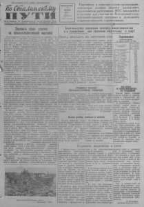 Пролетарии всех стран, соединяйтесь1. ШСпмЛших&Щ П У Т И Орган Северного РК Коммунистической партии Советского Союза и районного Совета депутатов трудящиеся Новосибирской области ВОСКРЕСЕНЬЕ 18 АПРЕЛЯ 1954 г. № 31 (1630) Цена 10 коп. Партийные и комсомольские организации, агитаторы должны широко разъяснять колхозникам, работникам МТС показатели и условия для участия на Всесоюзной сельскохозяйственной выставке и возглавить социалистическое соревнование. Завоевать право участия на сельскохозяйственной выставке В постановлении Совета Министров СССР и ЦК КПСС «о Всесоюзной сельскохозяйственной выставке» говорится о том, что с 1 августа 1954 го да в г . Москве открывается постоянно действующая Всесоюзная сельскохозяйственная выставка. Она призвана широко пропагандировать достижения социалистического сельского хозяйства, быстрее внедрять в колхозное производство передовой опыт колхозов, совхозов, машинно-тракторных станций, передовиков и организаторов, а также достижения научно- исследовательских и опытных учреждений. Социалистическое сельское ХОЗЯЙСТВО достигло огромных успехов под руководством пашей Коммунистической партии, оно является самым крупным п механизированным хозяйством в мире. Неуклонно развивается общественное хозяйство колхозов, крепнет год от года, день ото дня колхозный строй. 11 у нас есть что показать на предстоящей выставке, которая достойно отразит эти успехи, будет способствовать дальнейшему подъему сельского хозяйства, завоеванию новых славных побед социализма в колхозной деревне. На выставке широко будут представлены колхозы, совхозы, МТС, районы, которые достигли установленных показателей > но растениеводству, животноводству п выполнили обязательства но сдаче госу дарству сельскохозяйственной продукции н натуральной оплаты за работы МТС. Предоставляется полное право участия на выставке также колхозникам и работникам МТС, добившимся установленных показателей по урожайности культур и продуктивности животноводства. Труженики колхозов н МТС нашего района та кте с успехом могут завоевать право участвовать на Всесоюзной выставке, продемонстрировать свои достижения и перенять опыт других. Повышают продуктивность коров в колхозах им. Кагановича ц «Память Куйбышева», соревнуясь за высокие надоп молока. В зимнее время они надаивают по *12— 14 литров в день от каждой коровы, летом можно надаивать гораздо больше при правильном пастбищном содержании и подкормке более питательными кормами. Хорошо трудятся чабаны колхоза им. Маленкова, «Намять Куйбышева» и других, вырастившие на 100 овцематок большое количество ягнят. Надо добиваться ещё лучших результатов по выращиванию приплода п настригу шерсти н завоевать право участия на выставке. Многие механизаторы МТС, льноводческие звенья, совершенствуя своё мастерство, добиваясь высоких урожаев зерновых н технических культур, также могут быть кандидатами на выставку в столицу нашей страны. И колхозы района вполне могут завоевать такое почетное право при хорошей организации труда п достижении высоких показателей в развитии всех отраслей колхозного производства. Совет Министров СССР п ЦК КПСС утвердили п в с » ш леппс Главного комитета Всесоюзной сельскохозяйственной выставки «О показателях и условиях для отбора участников Всесоюзной сельскохозяй