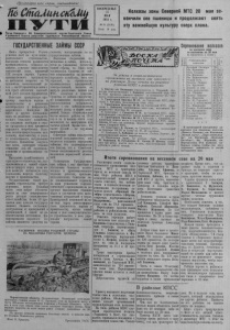 Пролетарии всех стран, соединяйтесь! ШСмйЛшмнЯАш ПУ ТИ % Орган Северного Р.К Коммунистической партии Советского Союза и районного Совета депутатов трудящихся Новосибирской области ВОСКРЕСЕНЬЕ 23 МАЯ 1954 г. № 41 (1610) Цена 10 коп. Колхозы зоны Северной МТС 20 мая закончили сев пшеницы и продолжают сеять эту важнейшую культуру сверх плана. ГОСУДАРСТВЕННЫЕ ЗАЙМЫ СССР Наша прекрасная Родина успешно идёт по пути коммунистического строительства. Высокими темпами развивается промышленность сельское хозяйство, успешно выполняется пятплетнпй план, принятый XIX съездом партии. Уровень промышленного производства за пятилетие возрастет на 70 процентов, национальный доход — на 60 процентов,в связи с чем будет обеспечен дальнейший рост доходов трудящихся. Поистине грандиозную программу наметили партия п правительство в решениях сентябрьского п февральско- мартовского Пленумов ЦК КПСС п других постановлениях по развитию социалистического сельского хозяйства, по созданию изобилия в стране продуктов и всех предметов народного потребления. Большие льготы предоставлены колхозному крестьянству в уплате сельхозналога, натуральных поставок. Повышены закупочные цены, проведено седьмое ■снижение цен на продовольственные п промышленные товары. Программа хозяйственного п культурного строительства, осуществляемая в нашей стране, демонстрирует перед всем миром великую жизненную силу социализма, мирную политику партии п правительства. Осуществление такой программы строительства требует огромных затрат. Большая часть этпх затрат обеспечивается за счет непрерывного роста доходов социалистического хозяйства. Более 80 процентов всех доходов государственного бюджета составляют поступления от предприятий и организаций. А одним из дополнительных источников финансирования народного хозяйства являются средства населения, поступающие по государственным займам. Народные сбережения, помещаемые в займы, используются на умножение богатства нашей страны, на благо всех трудящихся. Средства от займов направляются на развитие народного хозяйства, всех его отраслей, на строительство промышленных предприятий, электростанций, каналов, на выпуск различных машин для МТС, колхозов и совхозов. Средства от займов способствуют повышению материального благосостояния трудящихся. Вместе с тем займодержатели получают доход в форме выигрышей. Только сберегательные кассы нашего района за 1953 год п за 4 месяца этого года выплатили по выигрышам 434 тысячи рублей. Кроме того, 39 тысяч рублей — по крупным выигрышам. Советские займы пользуются огромной популярностью, они являются подлинно народными займами. Это подтверждается тем фактом, что в Советском Союзе насчитываются десятки миллионов держателей облигаций. Размещение Государственных займов у нас проходит в обстановке большого политического п производственного подъема рабочих, крестьян, интеллигенции. Советские люди ознаменовывают подписку на заем усилением социалистического соревнования за досрочное выполнение стоящих задач п улучшение всех качественных показателей в труде. Единодушной подпиской на за ем наш народ демонстрирует свою преданность партии и правительству, вносит новый вклад в дело коммунистпческо го строительства, в дело укрепления ' могущества нашей страны. Соревнование колхозов на