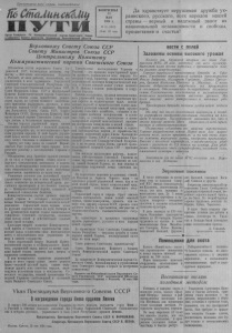 Пролетарии всех стран, соединяйтесь! Ш СмаЛшин&Мц П У Т И Орган Северного РК Коммунистической партии Советского Союза и районного Совета депутатов трудящихся Новосибирской области ВОСКРЕСЕНЬЕ | 30 МАЯ 1954 г. №43( 1612) | Цена 10 коп. ; Да здравствует нерушимая дружба украинского, русского, всех народов нашей страны — верный и надежный залог их национальной независимости и свободы, процветания и счастья! Верховному Совету Союза ССР Совету Министров Союза ССР Центральному Комитету Коммунистической партии Советского Союза Юбилейная сессия верховного Совета Украинской ССР, посвященная великому торжеству —300-летпю воссоединения Украины с Россией, от лица рабочих, колхозников, интеллигенции п всех трудящихся Украинской Советской Социалистической Республики сердечно благодарит Верховный Совет Союза ССР, Совет Министров Союза ССР н Центральный Комитет Коммунистической партии Советского Союза за теплые слова приветствия украинскому народу по случаю великого национального праздника украинского, русского п всех братских народов СССР и выражает Президиуму Верховного Совета Союза ССР, Совету Министров СССР, Центральному Комитету Коммунистической партии Советского Союза горячую любовь п беззаветную преданность. Веками боролся украинский народ против иноземных поработителей —польской шляхты, турецко-татарских орд, за воссоединение с братским русским народом. В этой борьбе украинский народ всегда видел в русском народе верного своего союзника п надежного защитника. Триста лет тому назад па славной Переяславской Раде украинский парод принял историческое решение о воссоединении Украины с Россией. Объединение двух братских народов умножило их силу в борьбе против общих врагов — царского самодержавия, помещиков и капиталистов, великодержавных шовинистов и украинских националистов, против всех иноземных захватчиков, зарившихся на наши земли Решающее значение для дальнейшей судьбы украинского народа как и всех пародов СССР, имело появление на исторической арене российского пролетариата и его боевого авангарда — Коммунистической партии, созданной и выкованной гениальным Лениным. Коммунистическая партия иривела пароды нашей страны к всемирно - исторической победе Великой Октябрьской социалистической 1 революции. Украинский народ первым вслед за русским пародом пошел по пути Октября и под руководством партии создал национальное суверенное Советское государство, положив этим начало новой и действительно славной эпохи своей истории. Благодаря мудрой политике Коммунистической партии и Советского правительства украинский народ осуществил свою многовековую мечту о воссоединении всех украинских земель в едином государстве. Тесно сплоченный вокруг Великой Коммунистической партии и ее Центрального Комитета, украинский народ вместе со всеми наро дамп нашей страны уверенно идет вперед к торжеству коммунизма. В днп всенародного торжества украинский народ от всего сердца славит своего родного брата—великий русский народ, славпт нерушимую дружбу всех советских народов, являющуюся источником силы и могущества Советского государства, основой процветания Советской Украины—неотъемлемой и составной части Великого Советского Союза. Трехсотлетие воссоединения Украины с Россией — это праздник нерасторжимой дружбы русс