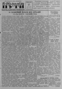 Пролетарии всех стран, соединяйтесь) ЯбСшЛияас&Мц П У Т И Орган Северного РК Коммунистической партии Советского Союза и районного Совета депутатов трудящихся Новосибирской области ВОСКРЕСЕНЬЕ 4 ИЮЛЯ 1954 г. № 53 (1652) Цена 10 коп. Труженики колхозных полей! В ответ на решение Пленума ЦК КП СС еще шире развернем социалистическое соревнование за претворение в жизнь поставленных задач перед сельским хозяйством. ЗА ДАЛЬНЕЙШИЙ ПОДЪЕМ ВСЕХ ОТРАСЛЕЙ С Е Л Ь С К О Г О Х О З Я Й С Т В А В печати опубликовано постановление Пленума Центрального Комитета Коммунистической партии Советского Союза «Об итогах весеннего сева, уходе за посевами, о подготовке к уборке урожая п обеспечении выполнения плана заготовок сельскохозяйственных продуктов в 1954 году». В этом важнейшем документе партии подведены первые итоги борьбы за выполнение решений сентябрьского н февральско-мартовского Пленумов ЦК КПСС, определены самые насущные п неотложные задачи тружеников сельского хозяйства. Трудящиеся нашей страны с величайшей радостью п воодушевлением встретили постановление Пленума ЦК КПСС. В этом решении нашла свое выражение неустанная забота нашей партии о крутом подъеме всех отраслей сельского хозяйства, о дальнейшем укреплении могущества Советской Родины, о повышении благосостояния народа. Проведенная партией и правительством большая работа по дальнейшему укреплению сельского хозяйства позволила колхозам, МТС п совхозам более организованно провести весенний сев п повысить к а чество сельскохозяйственных работ. Колхозы и совхозы перевыполнили государственный план сева яровых культур п посеялп на 9,5 миллиона г е к таров больше, чем в 1953 году. При этом посевные площади яровых зерновых культур увеличены на 6.429 тысяч гектаров, в том числе посевы пшеницы — на 3.583 тысячи ге к таров, кукурузы на зерно — на 756 тысяч гектаров. Площади под хлопчатником возросли на 354 тысячи гектаров. Больше, чем в прошлом году, посеяно сахарной свеклы, овощей, подсолнечника, картофеля, кормовых п силосных куль тур. Улучшилась деятельность машинно-тракторных станций. Колхозы и совхозы перевыполнили государственное задание по посеву зерновых куль тур на целинных п залежных землях. При плане посева 2,3 миллиона гектаров фактически посеяно зерновых культур на целинных н залежных землях 3,6 миллиона гектаров. В районах освоения новых земель весной 1954 года организовано 124 зерновых совхоза с общей площадью пахатно- прнгодных земель 2.532 тысячи гектаров. В МТС п совхозы, осваивающие целинные и залежные земли, к весне те ку щего года завезено 50 тысяч тракторов (в 15-сплыюм исчислении) и много других машин. В постановленпп Пленума ЦК КПСС отмечается, что эти ►успехи колхозов, МТС и совхозов показывают, какие о громные резервы заложены в социалистическом сельском хо зяйстве для значительного расширения посевных площадей и увеличения валовых сборов зерна и других продуктов и как эти резервы нрп должной организаторской деятельности партийных организаций можно в короткие сроки привести в действие в интересах дальнейшего мощного развития сельского хозяйства. Весенний сев—лишь первый этап в борьбе за высокий урожай. Впереди — напряженная работа, определяющая успех годового труда колхозников, работников МТС и совхозов. Можно хорошо посеять и не собрать нужного урожая, если во-время не бу