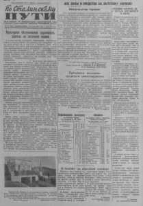 П ролетариа всех стран, соединяйтесь! ЯбСпшМиижЯМи И ^ Т Г И Орган Северного РК Коммунистической партии Советского Союза и районного Совета депутатов трудящихся Новосибирской области № 55 (1654) ВОСКРЕСЕНЬЕ, 10 июля 1954 года. | Цена 10 коп. Культурное обслуживание трудящихся, занятых на заготовке кормов В полном разгаре заготовка кормов в колхозах района. Сейчас дорог каждый час и надо мобилизовать все силы и средства, производительно использовать техни ку , правильно организовать труд на лугах, оперативно руководить этой важнейшей кампанией, широко развернуть социалистическое соревнование. Немаловажна роль в этом работников культурных учреждений. Они обязаны поставить на должный уровень просветительную работу, улучшить культурное обслуживание тружеников, занятых на заготовке кормов. Заведующие сельскими клубами, бнблнотекамп должны быть первыми помощниками партийным организациям в распространении опыта передовиков, отмечать лучших людей на доске показателей, в печати, организовать лекции, беседы, наладить работу красных уголков в бригадах, обмен кн и г в передвижных библиотеках , регулярную доставку га зет, журналов. Отделом культуры намечены ряд мероприятий но культурному обслуживанию тружеников, работающих на силосовании и сенокошении, и надо, чтобы этп меры претворялись в дело. Правда, сейчас организована и дает концерты агнтбрпга- да Дома культуры. Обслужены колхозники сельхозартелей нм. М. Горького, им. Кагановича, им. Жданова. Побудет бригада в колхозах зоны Северной МТС, а также в им. Маленкова и «Новая жпзнь». Она ставит своей целью пропаганду решений июньского Пленума ЦК КПСС. Тепло встречаются п художественные выступления. Не плохо развертывает работу агитбригада Гражданцевско- го сельского клуба, состоящая пз 9 человек, иод руководством т. Кыштымовой, Верх-Красно- ярского, где заведующей клубом т. Носырева. Здесь четко спланирована работа, хорошо поставлена самодеятельность. Вместе с колхозниками работают участники самодеятельности села Бпазы п в ¡перерывах плп вечерами дащт концерты. Но не везде так. Бездействуют пли совсем не созданы агптбрпгады в Болыце-Кулпков- ском, Чебаковском, Ново-Троицком п Федоровском сельских клубах. В планах работы кл у бов во главе должна стоять задача обслуживания трудящихся в поле п на лугах. В них надо предусматривать проведение лекций, докладов, бесед, концерты, оформление наглядной агитацией станов, вагончиков, жилья пастухов, выпуск стенной печати с показом передового опыта, работа библиотек, организация раднослушаиня,показ кино , световая газета н т.д., п т.д. Но все это далеко недостаточно отражено в планах этих клубов. Отдел культуры ослабил здесь свой контроль. На местах партийные организации п сельсоветы не вникают глубоко в работу культучреж- деипй, не помогают им. А ведь деятельность каждого клуба, каждой пзбы-чпталыш, библиотеки должна быть связана тесно с жизнью колхозов, МТС, быть центром всей воспитательной н культурной работы на селе, отвечать требованиям п задачам. В деле культурного обслуживания трудящихся необходимо устранять все недостатки. Работники культучреждеиий должны - четко планировать свою работу, предусматривать все формы воспитания. Партийные организации обязаны взять под свой контроль работу сельских клубов, пзб-чи- , талей, библиотек. ч Грознен
