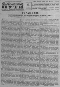 2 ПО СТАЛИНСКОМПУТИ 18 июля 1954 года О Б Р АЩЕ Н И Е участников совещания передовиков сельского хозяйства Сибири ко всем колхозникам, колхозницам, работникам МТС, совхозов, заготовительных органов и специалистам сельского хозяйства Сибири _______• (Окончание) кителями, сделать прнсиособ- ления к комбайнам для уборки высокорослых п полеглых хлебов, правильно отрегулировать машины. Для обмолота хлебов п подработки зерна прп любой погоде следует построить и отремонтировать достаточное коли чество сушилок, навесов п механизированных крытых токов. В текущем году нам предстоит перевезти большое количество зерна в государственные и колхозные амбары. В связи с этим мы обязаны своевременно подготовить автомобильный ц гужевой транспорт колхозов п совхозов, заранее выделить опытных возчиков. На перевозках хлеба решающая роль принадлежит шоферам.Товарищи .шоферы, включайтесь в социалпстнческое соревнование за образцовую перевозку зерна без потерь. Интересы дальнейшего укрепления могущества нашей Подины и неуклонного подъема благосостояния народа требуют, чтобы колхозы и совхозы успешно выполнили государственные задания но заготовкам н закупкам сельскохозяйственных продуктов Мы призываем колхозников н колхозниц, работников МТС и совхозов, специалистов сельского хозяйства приложить все силы к досрочному выполнению планов заготовок н закупок хлеба и других продуктов, а также обеспечить засыпку колхозами и совхозами доброкачественных семян, создание фуражных и страховых фондов. На заготовительные пункты пойдет много сибирского хлеба. Наша обязанность хорошо организовать его приемку и сохранность. Мы обращаемся с призывом ко всем работникам заготовительных органов, элеваторов п пунктов обеспечить своевременную подготовку складского хозяйства, бесперебойную приемку хлеба, работу сушилок и зерноочистительных машин, максимально механизировать , погрузочно-разгрузочные работы, подготовить дороги, подъездные пути к элеваторам и пунктам приемки хлеба, не допускать потерь при приемке и хранении зерна. Дорогие товарищи! Колхозы и совхозы Сибири занимают важное место но производству продуктов животноводства в стране. Мы имеем большие возможности и резервы дальнейшего увеличения поголовья скота и повышения его продуктивности. У пас богатейшие пастбищные и сенокосные угО'- дпя; в текущем, году колхозы и совхозы цосеяли кормовых культур значительно больше, чем в предыдущие годы. Задача заключается в том, чтобы полнее использовать эти возможности, в каждом колхозе и совхозе создать прочную кормовую базу для животноводства и обеспечить скот благоустроенными помещениями. Сейчас наступил решающий период заготовки кормов. Надо немедля включить в работу все тракторные и конные сеноуборочные машины, обеспечить выполнение и перевыполнение норм выработки на косьбе, сгребании и скирдовании сена, завершить повсеместно сенокос до начала массовой уборки хлебов. После работы комбайнов без промедления уберем с полей всю солому и полову. Обеспечим накопление грубых кормов нз расчета .не менее 27 центнеров на одну голову крупного рогатого скота. Мысчитаем необходимым обратить особое внимание на выполнение плана силосованйя кормов с тем, чтобы заготовить не менее 5—0 тонн силоса для каждой коровы. Для этого обеспечим надлежащий уход з