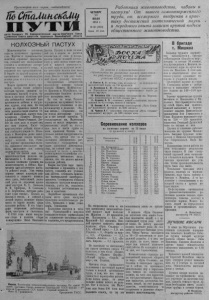 Пролетарии всех стран, соединяйтесь! -1* СшМшжЯМц 1В У Г И орган Северного РК Коммунистической партии Советского Союза и районного Совета депутатов трудящиеся Новосибирской области ЧЕТВЕРГ 29 ИЮЛЯ 1954 г. № 60 (1659) Цена 10 коп. Работники животноводства, чабаны и пастухи! От вашего самоотверженного труда, от всемерного внедрения в практику достижений зоотехнической науки и передового опыта зависит крутой подъем общественного животноводства. КОЛХОЗНЫЙ ПАСТУХ Животноводство — доходная отрасль колхозного производства. Партия п правительство наметили огромные мероприятия, создают все необходимые условия к всемерному воспроизводству колхозного стада, к поднятию его продуктивности. В борьбе за крутой подъем общественного животноводства велика роль к о л х о з н о г о пастуха. Можно привести много примеров,. когда своим добросовестным трудом, умением организовать пастьбу п уход, чабаны и пастухи колхозов района добиваются высокой продуктивности дойных и нагульных гуртов, отар овец. Не так давно на страницах нашей газеты делился своим опытом 70- летнпй колхозник, пастух сельхозартели «Память Ленина» Афанасий Фомич Романов. Любит он свое дело и отдает ему все своп знания. Пасет он круглосуточно дойных коров п как сообщают доярки тт. Шала- гина и Нескорова резко заметно повышение надоев молока, нагул нетелей. Тов. Романов хорошо организовал пастьбу, правильно использует выпаса, выполняет 'все советы зооветспепиаллстпв А вот что пишет нам зав животноводством колхоза им. Кагановича А. С. Ларченко:«... большое внимание уделяем мы животноводству и сейчас. При меняем круглосуточную пасть бу дойного стада. Уже теперь коровы имеют хорошую упитанность и намного повысились удои. Заботливый, ласковый уход за коровами проявляют пастухи Ф. Т. Бакалов, Ц. Ф. Храброва, В. Слепцова и В. Вербицкая, которые работают в две смены». Колхоз из месяца в месяц, в зимний п летний период занимает первое место по надою молока среди колхозов района. И это благодаря стараниям работников ферм, пастухов п скотников. С 1951 года пасет нагульное стадо в колхозе «Заря коммунизма» Илья Иванович Драган. Уходит в ноле он каждый год в апреле за десятки километров от села п возвращается только поздней осенью. Скот у него всегда выше средней п жирной упитанности, за свой труд он получает десятки центнеров молока пли мяса в порядке дополнительной оплаты. Вместе с тем дает большой доход родному колхозу. Заслуженным авторитетом пользуются знатные чабаны колхоза «Память Куйбышева» тт. Краснова п Шухайкина, выращивающие большое количество молодняка овец. Но так не везде. Резкого осуждения заслуживает бесхозяйственное отношение к животноводству в колхозах «Новая жпзнь», «Украинец», где не всегда постоянные пастухи и нет ночной пастьбы. В сельхозартели им. Маленкова никак не могут закрепить определенных людей на пасту шье дело и пасти гурты по всем правилам. Отсюда настолько низкая продуктивность скота, что артели этп не в состоянии своевременно рассчитаться с государством по сдаче продуктов животноводства, не говоря уже о сверх- Ш Щ П П Ц П Й П V Р . п я о о а п р п о б р о тении нужного в х зяйстве оборудования, автомашин, механизмов, как это делают многие колхозы района. Кадры пастухов надо иметь постоянные и проявлять о них заботу, создавать все условия для работы, соблюдать принципы ма