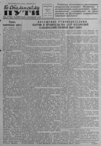 Пролетарии всех стран, соединяйтесь! Ш>Сталин а&Лщ П У Т И Орган Северног0 РК Коммунистической партии Советского Союза районного Совета депутатов трудящихся Новосибирской области ВОСКРЕСЕНЬЕ 1 АВГУСТА 1954 г. № 61 (1660) i Цена 10 коп. Товарищи колхозники и колхозницы, специалисты сельского хозяйства и механизаторы, шире развернём социалистическое соревнование за право участия на Всесоюзной сельскохозяйственной выставке! Усилить политическую рабоут Долг партийных организаций и их секретарей - повседневно проводить политическую и организационно-партийную работу в поле, на лугах, там, где решается успех дела оказывать влияние на широкие массы тружеников и-мобилизовать их на успеШноечвыполнение поставленных Пленумами ЦК КПСС задач. Лучшие силы агитаторов должын быть направлены на все участки работ, где трудятся люди. Широко надо использовать кино, радио, культурно-просветительные учреждения. Хороших успехов в проведениисельскохозяйственных работ добиваются те колхозы, где партийные организации используют все форым массово-политическойработы, там,где не уделяется внимания политической агитации, колхозы неорганизованно ведут полевые работы. Партийнаяорганизация колхоза «Новая жизнь» плохо ведет политико-массовую работу. Не все колхозники ознакомлены с постановлением июньского ПленумаЦК и с Обращением передовиков сельского хозяйства Сибири, неразвернуто социалистическое соревнование. Агитаторы раскреплнеы формальноникто из них в поле не бывает. Но выпускаются боевые листки, маловыписано газет,да и тене доставляются в бригады. Не распространяется опыт передовиков. 1 колхоз почти по всем работам занимаетодно из последних мест. Но коммунистов и секретаря парторганизациит. Серебрякову такое положение мало беспокоит. Хороший план политической работы составила парторганизация колхоза' им. Ворошилова на период заготовки кормов, но всё это осталось на-бумаге. Наступает уборка урожая — ответственный и завершающий этап сельскохозяйственного года. Вместе с тем нельзя ни в коем случае прекращать заготовку кормов, строительство скотопомещений. Поэтому очень и очень важно, чтобы все эти работы проходили в комплексе, надо правильно организовать труд и мобилизовать на это всех трудоспособных, всех учащихся старших классов. Партийные организации обязаны усилить политическую работу, охватить всех тружеников, кто бы где ни находился. Широко развернуть действенное социалистическое соревнование. Уже сейчас надо тщательно всесторонне продумать Мероприятия по проведению массово-политической работы, составить планы и неотступно их выполнять. П О С Е Щ Е Н И Е Р У К О В О Д И Т Е Л Я М И ПАРТИИ И ПРАВИТЕЛЬСТВА СССР ВСЕСОЮЗНОЙ СЕЛЬСКОХОЗЯЙСТВЕННОЙ ВЫСТАВКИ 25 июля руководители партии и правительства Советского Союза товарищи К. Е. Ворошилов, Л. М. Каганович, Г. М. Маленков, А. И. Микоян, В. М. Молотов, М. 3. Сабуров, Н. С. Хрущев п Н. Н. Шаталипносетли Всесоюзную сельскохозяйственную выставку, осмотрели павильоны, сооружения, участки экспонатных посевов и посадок, а также сад и животноводческие фермы. Руководителей партиии правительства сопровождали п давали объяснения председательГлавного комитета Всесоюзной сельскохозяйственной выставки, министр сельского хозяйства СССР И. А. Бенедиктов и директор выставки академик II. В. Цицни. В павиль