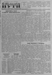 ч» уь « шшиши , уол, oac Пролетарии всех стран, соединяйтесь! Ш(ШаЛшик&Мц П У Т И Орган Северного РК Коммунистической партии Советского Союза и районного Совета депутатов трудящихся Новосибирской области ЧЕТВЕРГ 19 АВГУСТА 1954 г. №66 (1665) I Цена 10 коп. I Товарища комбайнеры и колхозники! Быстрее устраняйте все неполадки, дружно и слаженно ведите уборку урожая. На полную мощь используйте технику и все другие средства. Не допускайте потерь зерна. % Ч ВЫПОЛНИТЬ ПЛАН РАЗВИТИЯ ЖИВОТНОВОДСТВА Общественное с х т о в д о н —ых одна от п р з асле в й ажн ж к е и о й в л ш о х т и о н х з о н , в о д о г о д о т п н ч е е р о л н о ь и и с с ю з е т в р в о ь о д е с з п т н р в о и а е . да П ю з а т н р а т и ч и с е я к н л и ю и е чи п у т р в е а е л в л ь и и поголовья скота на д С ф у о е к в р т е м т и а а в х н М о и с и т н п и и о . с в т ы В р ш ов е п н о и с С ю т С ан С е о Р г в о ле и п н р и Ц о и К КПСС о мерах в ш а ем в у с р тр аз а в н и е ти и ю сн ж и и ж по в е о н т и н ю д о а в л о н ь д н о с р т е й м обязательных поставок д д у ар к с т т о в в у о ж т и м в е о ч т е н н о о в , од « с ч т т ва о дос г т о п и с р г у о нутый уровень производства мяса, молока, шерсти, яиц. кож и другой продукции в л в о е о т н з н р и о о я в с о ш в д и ст х э в т а и п х о н т е р п е р б о н у д д о у с о к т в т е л а й е х т , во а н р а л я ж с е е е и т г кой промышленности—в сырье. И зя н й т с е т р в е а сы н в а с с е т г о о яте н л а ь р н о о дн т о р г е о бую хо т д л а о л в ь ь н я ей ск ш о е т г а о у п вели з ч н е а н ч и и я тел п ьн ог о о го о с з п а н т о н а и в и ы » я . п ш р е В а п н о в и и я л м с ь н т н о р о е г е г и о м п х я о т н к с я п о я л р л и о хо д э к з у т а к п х ти у т р в к о н а а м й о у, ч п т р о о б и ы звод в с ы тв п а олн п и о т г ь оло п в л ья аны ск в о о т с а н т и е и л ю п и т , и п ц л к ы а а н к . ов Бл « и П т з а а к м к и и я е ть к се Л в л ы е ь н х п и о о з н л а н а р » е , «Новый путь», пм. Жданова, «Заря коммунизма» и другие. ж ны ив х У от п н н р о а и в с о м д е н о р е в ов ма ч - л е о стн п о е п р г о о е л д о о ж в т и и р т к у е о д л в а ь . д Н а е е с т к с о я ль П к о о чет л н е ы т ми под г р р я а д мо н та а м гр и аж и п л д о е о т н л о и у в ч я а ае к т т о . н д А ю е н х н т е и ж п к н е о ы н л е о х к о , в за о Н з е и н м аг . р о а М д ж н о у с н о а т р н к ю а арт п е о л р и ос « я Н т ов в ы ы й р п а у ст т и ь л » а I с I. в Н и . с ц Ш я а па к к к о о л с в в х а о о . и з м а С и п л м и ю т . о б м о ц в Ж ь ам ю дан т о о е т в л н а я о т с н и и т М . Соплпнова. Большой привес нагульного гурта получает II. И. Драган—знатный пастух из артели «Заря коммунизма». Высокие надои стали чать от коров в ко п л о х л о у з е с д т « е е е П т л а ь ч м А н а я о б . т а ь н Ф н о . а Л в д е о н к Р и о о о л н м т х а о а о » з н з , в о о а в к в т о . ь т с о я р П ы о о х л т о п р ж а у и «Память Куйбышева» и им. в М а ат т в т е . ев К о р й асн и ово д й р , у Ш ги у х х . ай М к а I н I л н е т н о . к й о , д . т Д за а ы х л А е о к и р н а в е о з о т ви т в т п ы и р в и п о о я о л ж в т н л и д е я в е н е о л и т т ь с я н н я о ы в п х о л д а с к н т о а з в л а а х б и . о о п н о ост п и огол с о ел в ь ь х ю о , зар и т н ел о и прод « у Н к о т в и а в я жизнь», «Борьба за мир», им. Сталина. В колхозе вая жизнь» н а ен рас н х и од по дох о о д д н и п о т л м а у н до в н и е д 1 у 5 в с г к ы о о « п л т Н о о а о л в , в месяц, допускается падеж. Надой молока на фуражную к н о о р го ову год к а на со ча ст л а а вля х е о т зяй т с о т л в ь е к н о 498 литров. А в нм. Сталина додумались вообще не иметь птпцефермы. 1 октября в колхозах буд