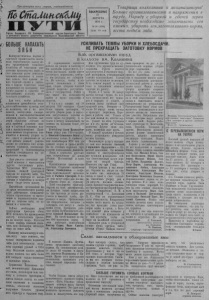 s Пролетарии всех стран, соединяйтесь! Ш ûnaJuHCfCêMit П У Т И ВОСКРЕСЕНЬЕ 29 АВГУСТА 1954 г. Орган Северного РК Коммунистической партии Советского Союза и районного Совета депутатов трудящихся Новосибирской области № 69 (1668) Цена 10 коп. Товарищи колхозники и механизаторы! Больше организованности и напряжения в труде. Наряду с уборкой и сдачей зерна государству необходимо заканчивать сев озимых, убирать лен,заготавливать корма, вести подъём зяби. БОЛЬШЕ НАПАХАТЬ ЗЯБИ Коммунистическая партия п советское правительство поставили ответственную задачу перед тружениками сельского хозяйства об ежегодном увеличении производства зерна за счет освоения ранее неиспользованных целинных и залежных земель. Этот призыв нашел горячий отклик и одобрение в народе. Советские люди восприняли эту программу, как боевое задание н средство по быстрейшему подъему всего сельского хозяйства. Для того, чтобы добиться повышения урожайности сельскохозяйственных культур, как на целинных, так и на всех землях, необходима своевременная п высококачественная зяблевая пахота. Система зяблевой обработки состоит из двух приемов: лущения жнивья п глубокой вспашки плугом с предплужниками. Лущением жнивья сохраняется имеющийся к моменту уборки запас влаги п увеличение её за счет летних дождей, уничтожение не успевших еще осемениться сорняков, насекомых- вредптелей и болезнетворных грибков, гнездящихся па поверхности почвы. Для умелого сочетания зяблевой вспашки с выполнением других неотложных работ, Тартасская МТС установи ла задание каждой тракторной бригаде по подъёму зяби. Все свободные тракторы от посева озимых и комбайнов в ночную смену будут вести пахоту. Партийным органзацпям надо среди механизаторов развернуть действенное социалистическое соревнование за выполнение п перевыполнение заданий на подъеме зяби, не забывая и о качестве. Сейчас необходимо всем тракторным бригадам обеих МТС начинать без промедления пахоту , ' использовать тракторы на полную мощь. Колхозы в свою очередь обязаны включить всю свободную тягловую силу на взмет зяби. Каждому механизатору и специалисту надо помнить, что только своевременно поднятая зябь даст возможность получить хороший урожай в 1955 году. Колхозам нашего района нужно поднять под зябь более 400 гектаров только целинных п залежных земель. Труженики колхозных полей, механизаторы! Приложим все сплы, используем всю технику и успешно претворим в жизнь боевую задачу по освоению целинных и залежных земель, обеспечим колхозам получение богатого урожая всех культур в будущем году. УСИЛИВАТЬ ТЕМПЫ УБОРКИ И ХЛЕБОСДАЧИ. НЕ ПРЕКРАЩАТЬ ЗАГОТОВКУ КОРМОВ Как организован труд в колхозе им. Калинина В соревновании колхозов района на уборке и хлебосдаче мы занимаем первое место. Хочется рассказать каким путем достигнуто первенство, которого мы упускать не собираемся. Но хочется, чтобы и все артели становились с нами вряд, скорее убирали богатый урожай, досрочно рассчитывались с государством. Район у нас имеет все возможности выйти в число передовых в области. У б р а н о озимых на 28 августа 350 гектаров. Сдано более тысячи центнеров. 30 августа уберем рожь и выполним августовское задание по сдаче зерна государству. А сегодня к вечеру заканчиваем сев озимых на площади более 500 гектаров. Комбайнер Адам Васильевич Смык убрал уже 130 г